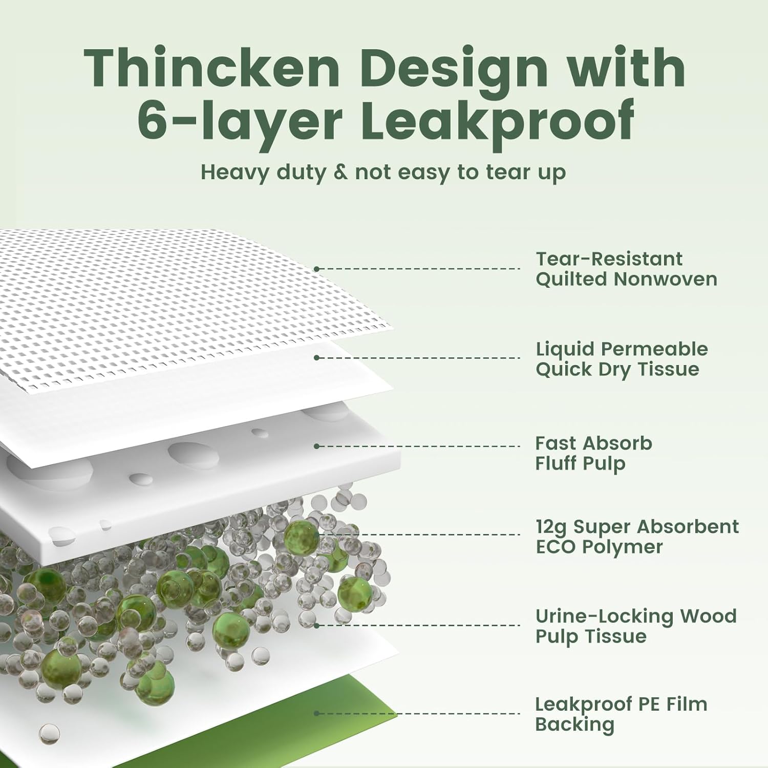 - EXTRA THICKENING, SUPER ABSORBENT: The dog pee pads extra large are made with a 6-layer layered core pad and the thickness of the pads has been increased, which greatly enhances the water absorption capacity. The thickened heavy duty PE waterproof membrane on the back is tear-proof, which can prevents liquid from penetrating into the floor or carpet. This is especially useful pet supplies for training puppies, as puppies may go to the toilet frequently in the early stages of training, this xl puppy pads can provide extra protection.