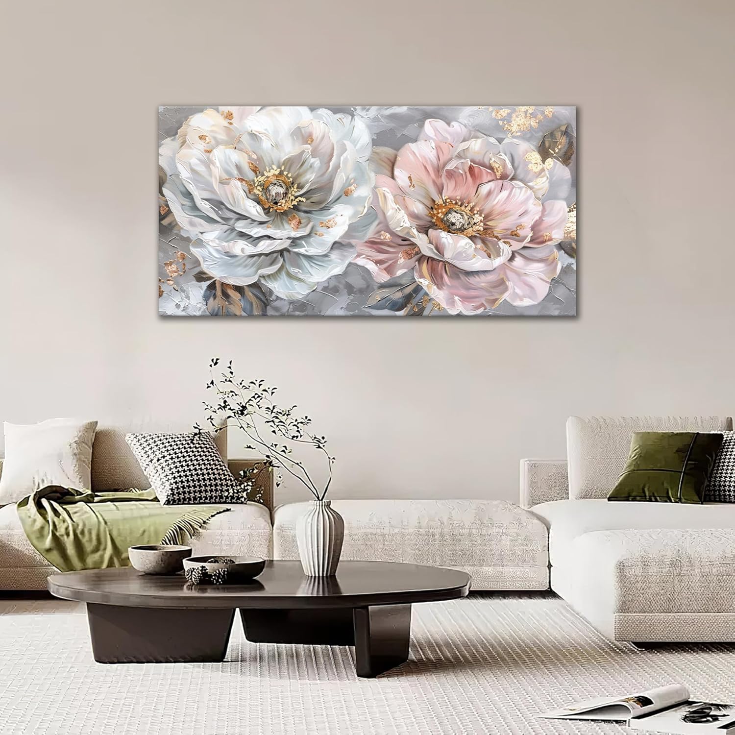 Extra Large Flower Wall Art Pink and White Floral Canvas Living Room Golden Pictures Framed Prints Oversize Wall Decor Big Painting Artwork for Bedroom Dining Office Home 60"x30"