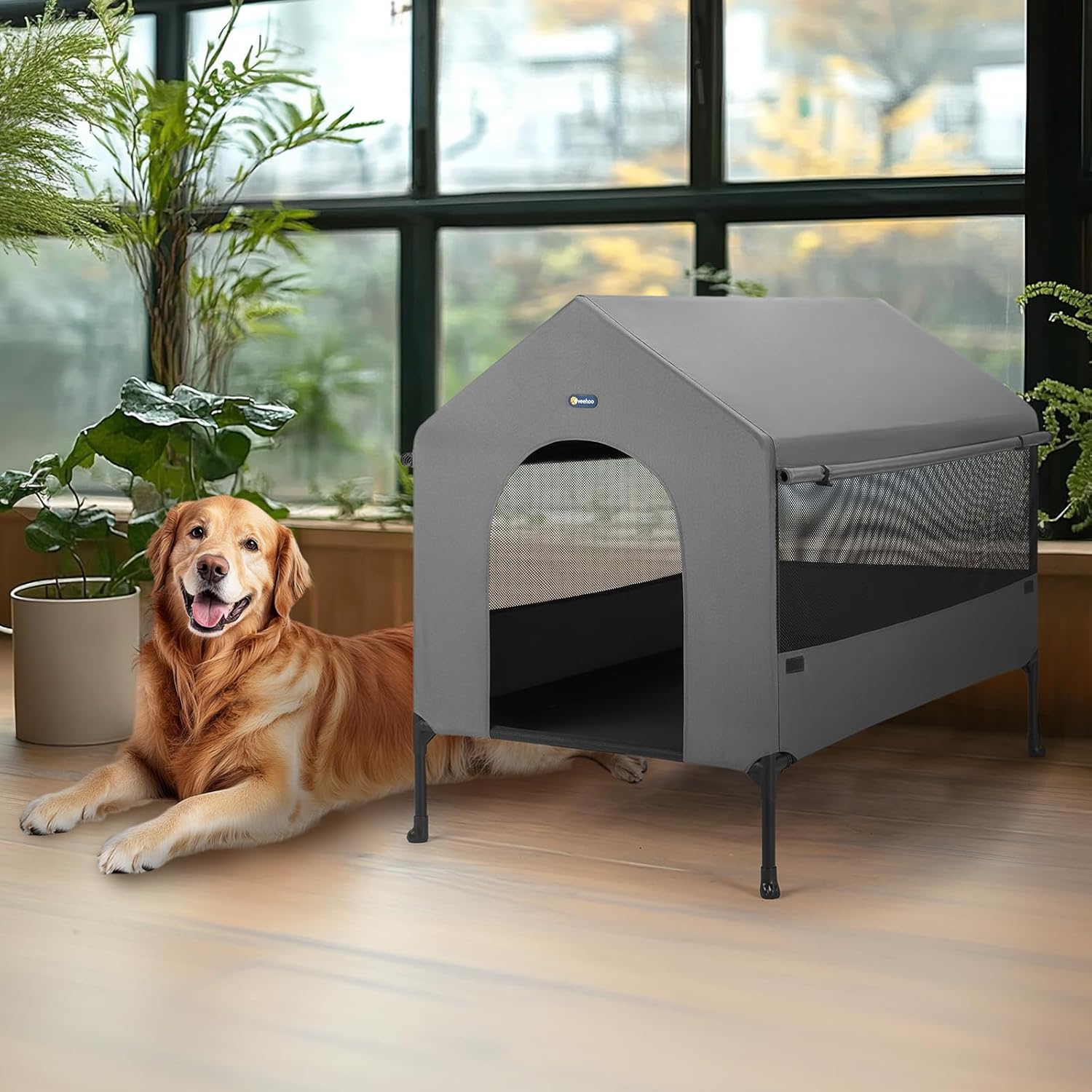 Veehoo 41" Dog House, 2-in-1 Large Dog House Outdoor Indoor Weatherproof, Outside Elevated Dog Cot Bed Dog Tent Shade, Three-Sided Breathable Mesh Windows and Sunshades, CWC2435CP