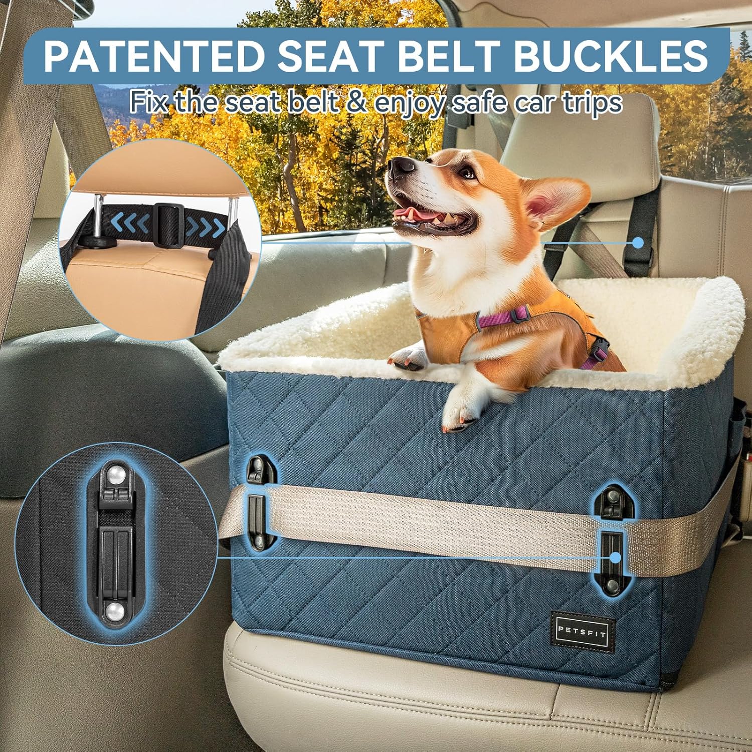 PETSFIT Pet Car Seat for Small Dogs, Soft Foam Dog Booster Car Seat with Patented Safety Buckles, Storage Pockets and Detachable Clip-On Safety Leash, Dog Carseat for Small Dogs Under 30 LBS (Blue)
