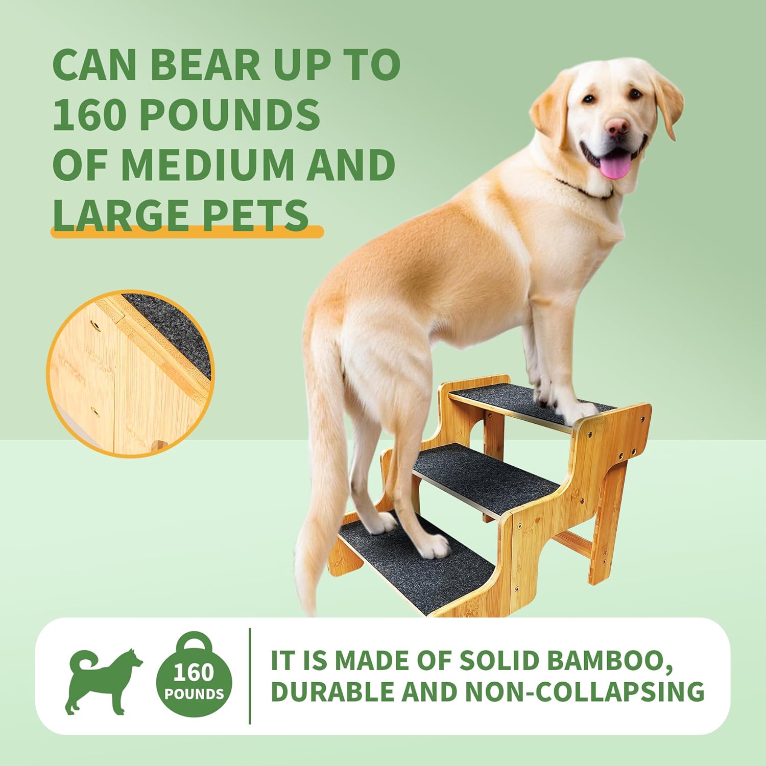 - [Natural Bamboo]The newest design of small dog steps are made of natural bamboo material. Each step tread in contact with the ground,are equipped with abrasion non-slip felts. With good thickness makes the dog stairs supportive、sturdy and durable. At the same time, the dog stair stable structural design adopts all kinds of small and medium-sized dogs oldder pets and cats.