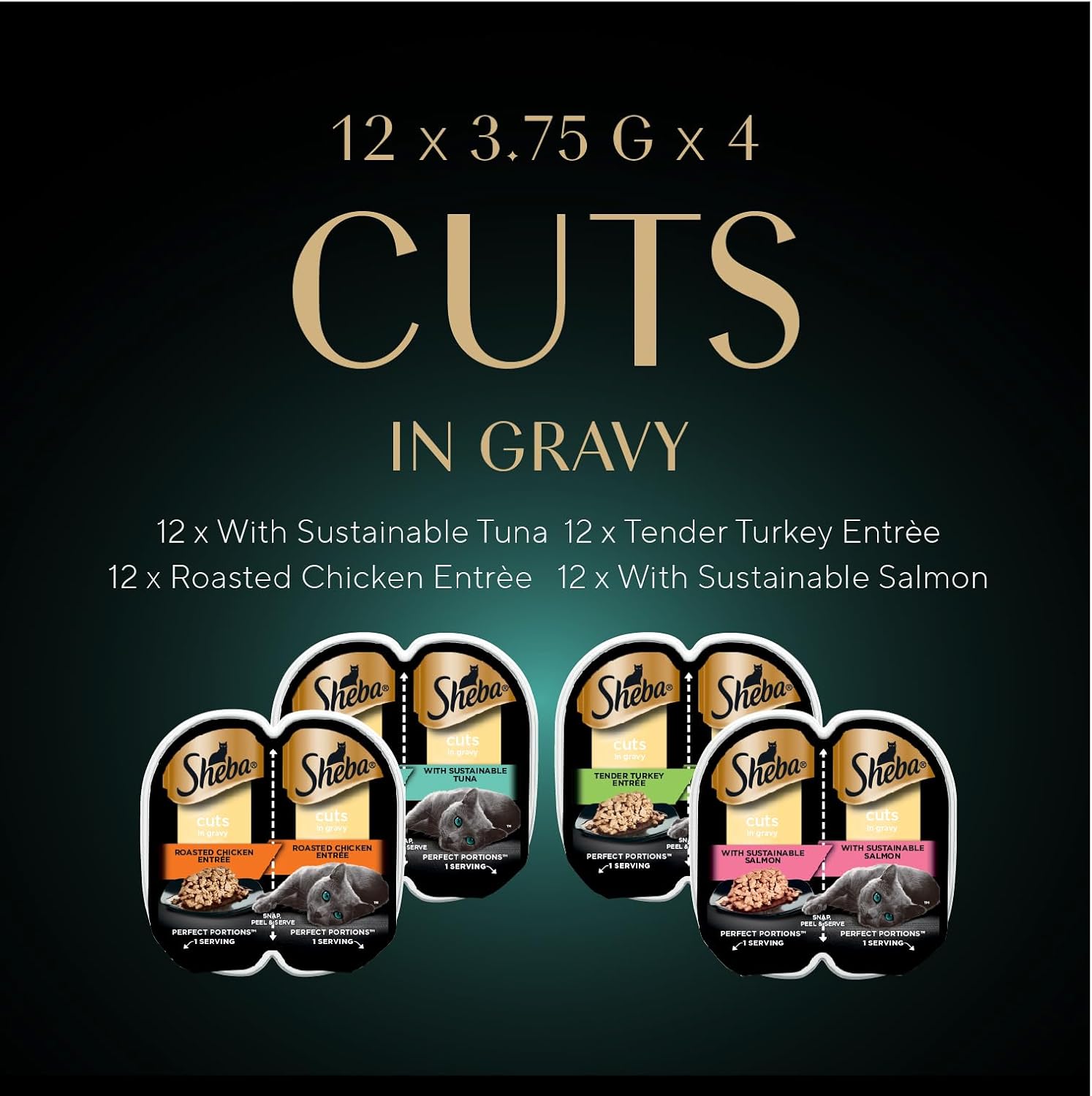 Sheba Perfect Portions Wet Cat Food Cuts in Gravy Variety Pack, Roasted Chicken, Tender Turkey, with Sustainable Salmon, and with Sustainable Tuna, 2.6 oz. Twin-Pack Trays (48 Count, 96 Servings)