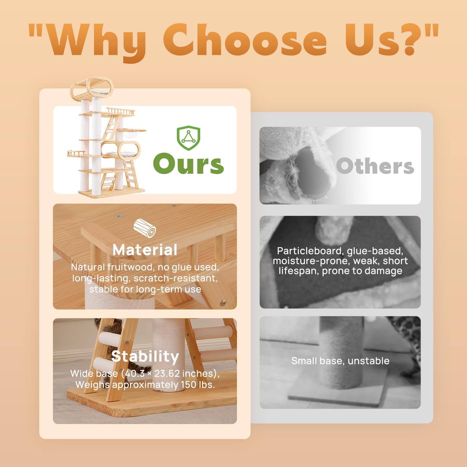 - Natural Pine Wood: KZLAA Tall Cat Tower weighs approximately 149 pounds and is made of natural pine wood and natural sisal, safe materials with no odor and will not cause harm to people and pets.