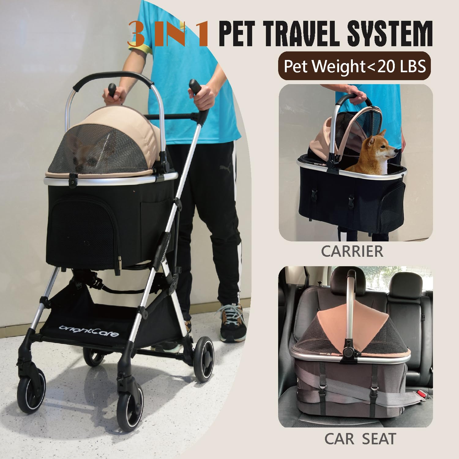 - 3-in-1 Versatile Design – Functions as a pet stroller, removable carrier, and converts to a car seat, perfect for daily use and travel.