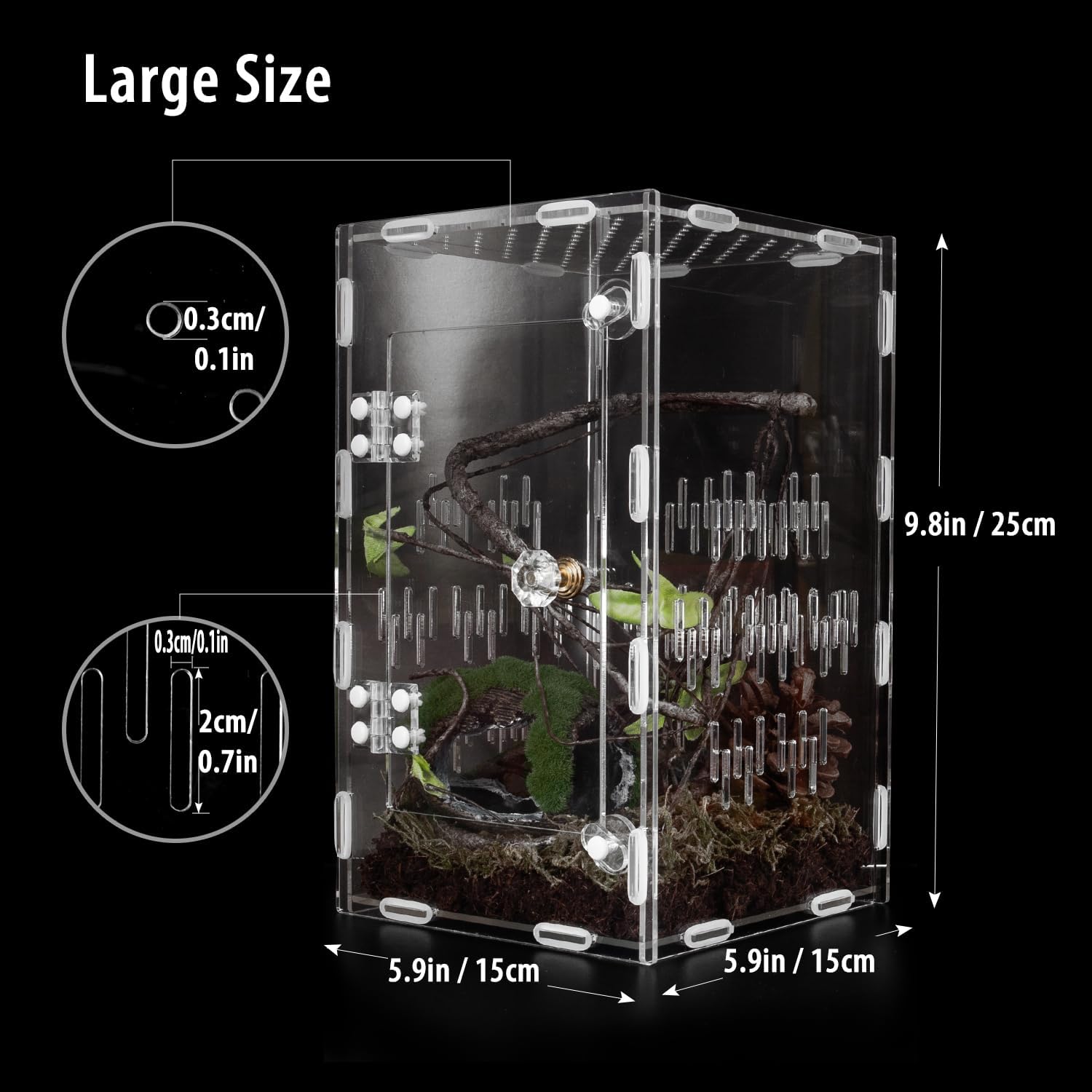 - 【 Large Space 】Our jumping spider enclosure is measured at 9.8"H*5.9"L*5.9"W, providing enough vertical living space for your reptiles pet to enjoy and explore.Front door opening is convenient for daily feeding and cleaning