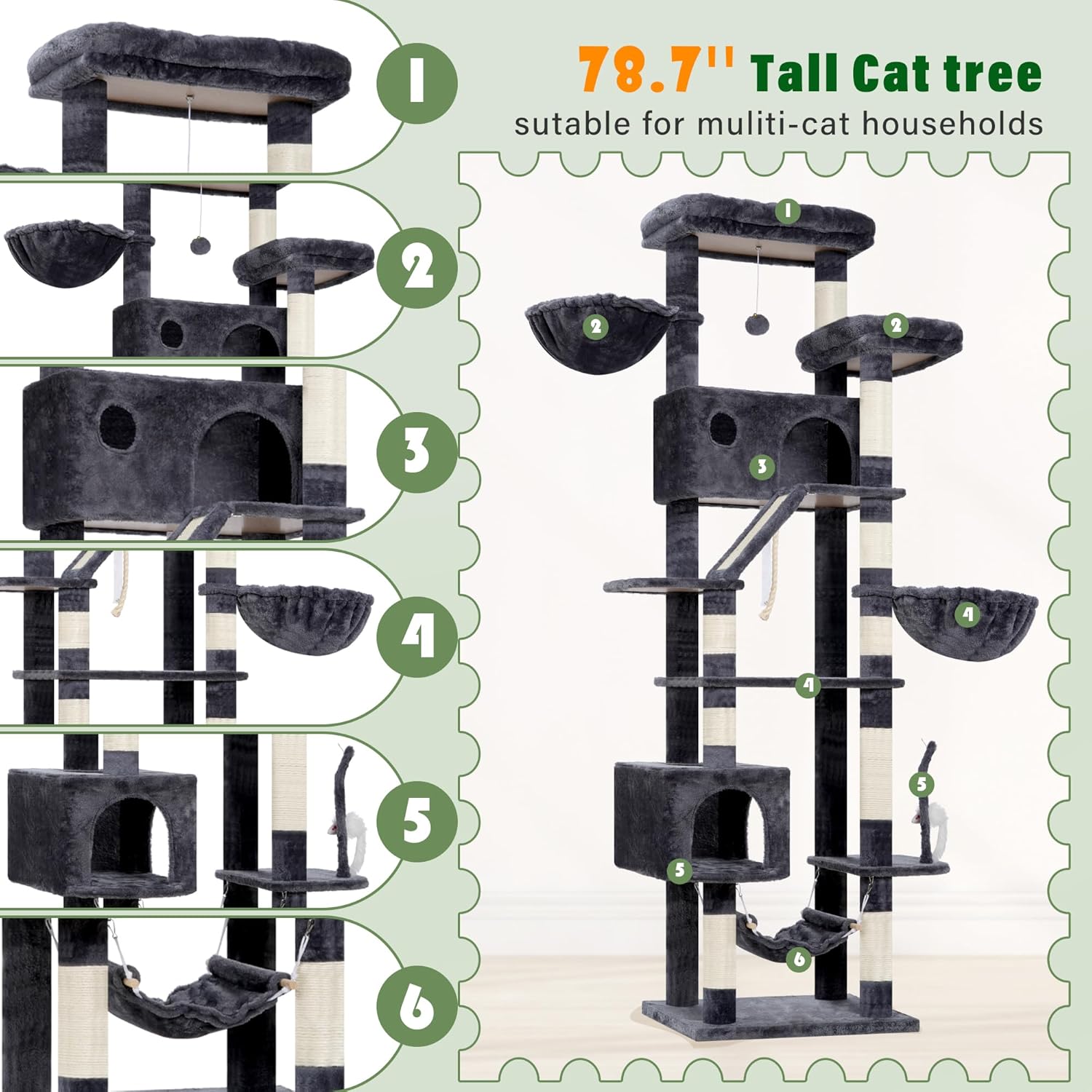 Cat Tree for Large Cats, 78.7"(200cm) Tall Cat Tower for Indoor Cats Multiple Cats with Large Top Perch, Cat Condo, Cat Hammcok, Cat Scratching Post, Dark Gray GCT031G
