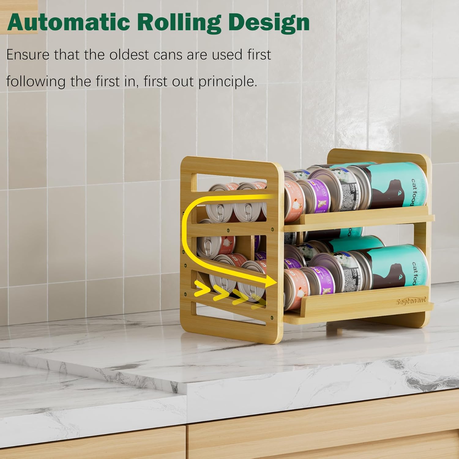Rolling Bamboo Cat Food Can Organizer, 2-Layer Wet Cat Food Storage Container Holds 42 (3oz) Cans, Canned Cat Food Organizer and Storage for Countertop Kitchen Cabinet or Pantry Shelf