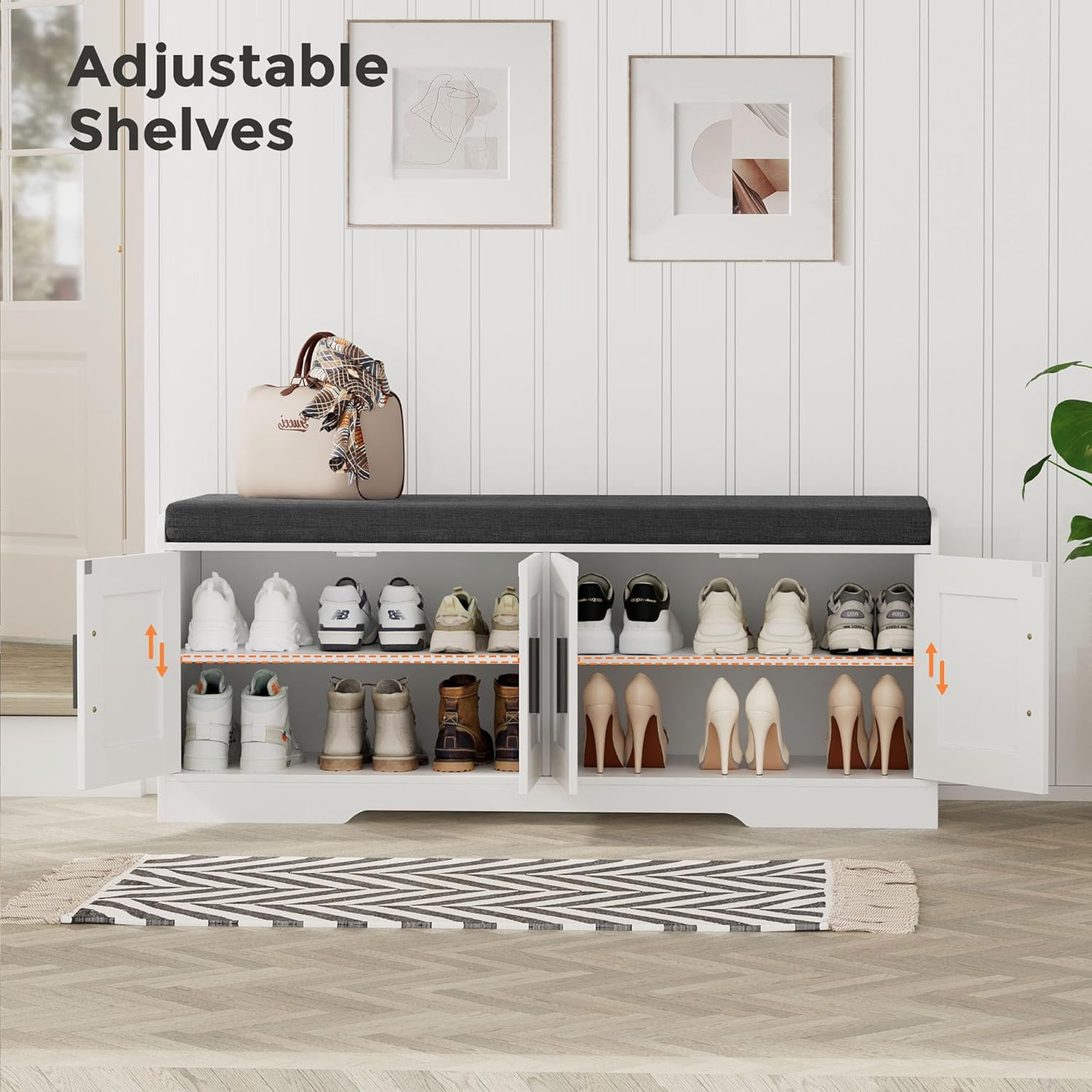 2-Tier Storage Bench, Shoe Bench with Thickened Padded Seat Cushion, Entryway Bench with 4 Doors, Adjustable Shelf, 13.8" D x 45.3" W x 18.5" H, for Entryway, Living Room, Bedroom, White