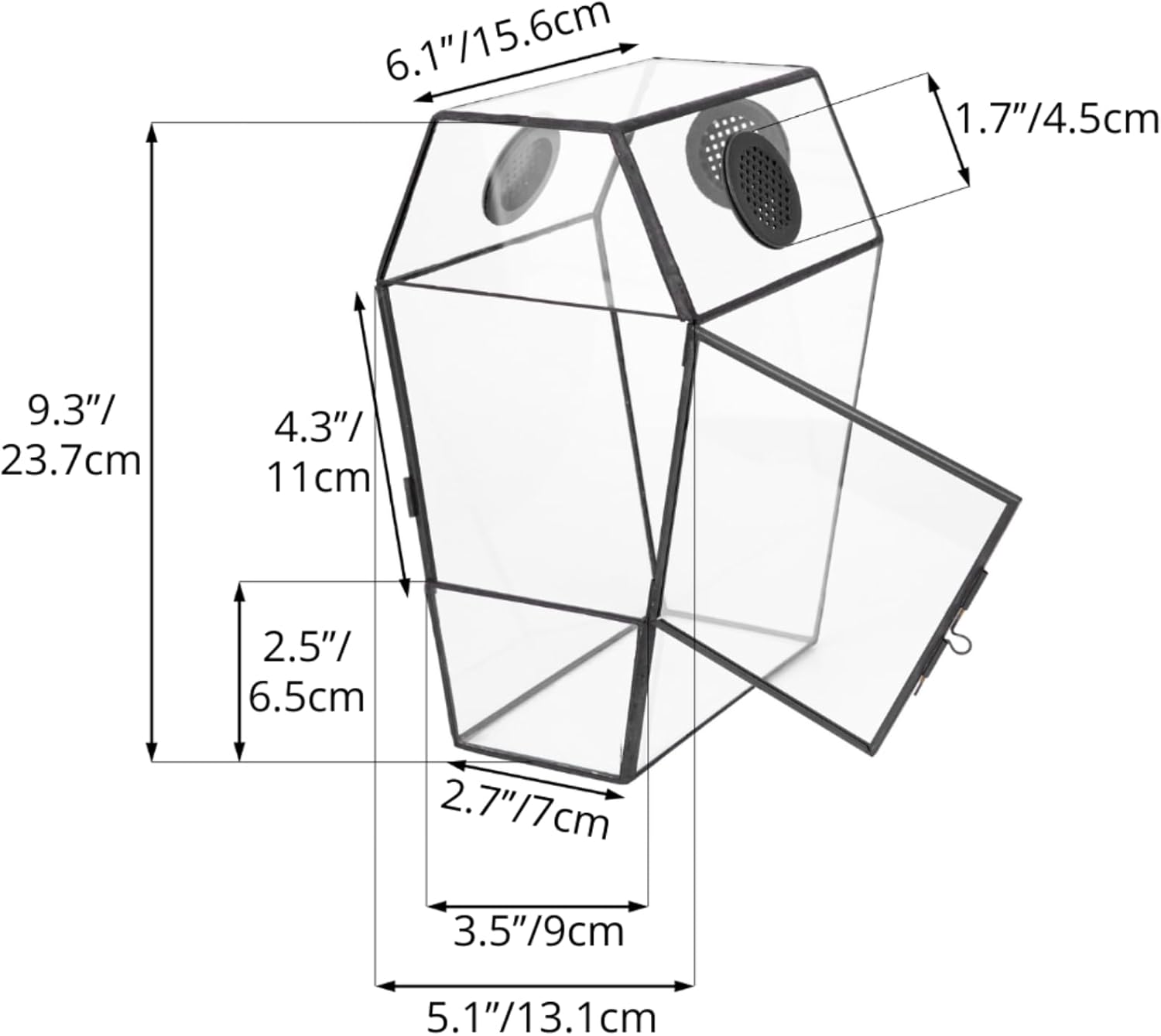 - Dimensions: 13.1 x 15.6 x 23.7 cm/ 5.1 x 6.1 x 9.3 inches; The door size: bottom length 9 cm/ 3.5 inches, top length 13.1 cm/ 5.1 inches, height 10.5 cm/ 4.1 inches; The terrarium only. Plants and decorations are NOT included