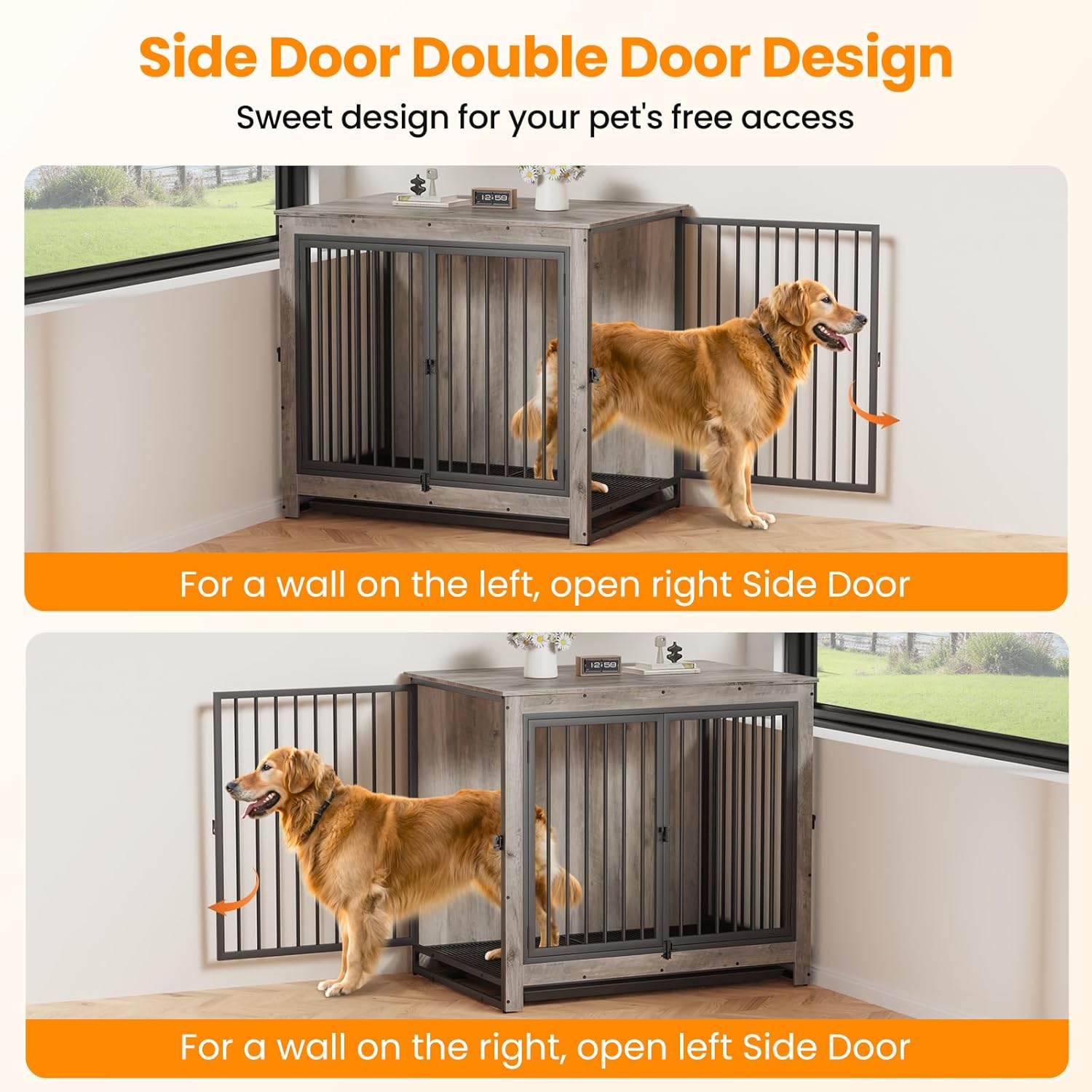- 🐶【Double Side Door Design】This furniture-style dog kennel indoor has front and two side openings for access, both the left side door and the right side door can be opened to fit various spaces, definitely an ideal crate for your home