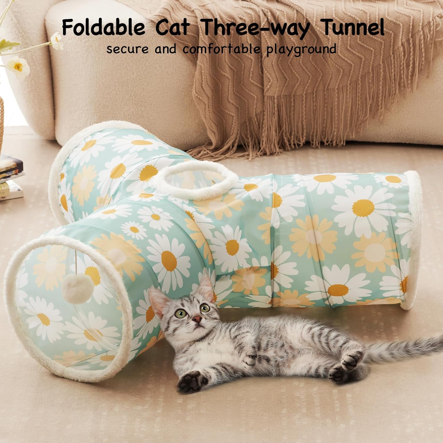Tempcore Pet Cat Tunnel Tube Cat Toys 3 Way Collapsible, Cat Tunnels for Indoor Cats,Kitty Tunnel Bored Pet Toys Peek Hole Toy Ball Puppy, Kitty, Kitten, Rabbit Daisy Green Printed