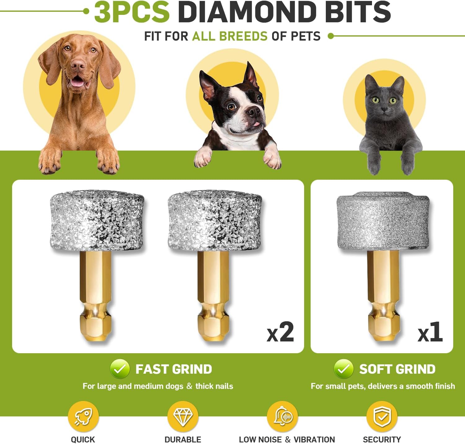 - 🎄🐾【3 Grinding Wheels, 3 Speeds, 3 Ports for All Sizes】Enjoy seamless pet nail care with the professional CADOLS silent dog nail grinder. Boasting a robust 3-speed motor (8000-12000rpm), it effortlessly tackles long and thick nails. Equipped with 3 replacement diamond grinding wheels separately, one super soft, two super hard,plus 3 tailored grinding ports, it caters to large, medium, and small dogs, cats,large breed . This versatile setup offers a comprehensive 360-degree nail grooming experience, ensuring stress-free nail trimming for all your furry friends.