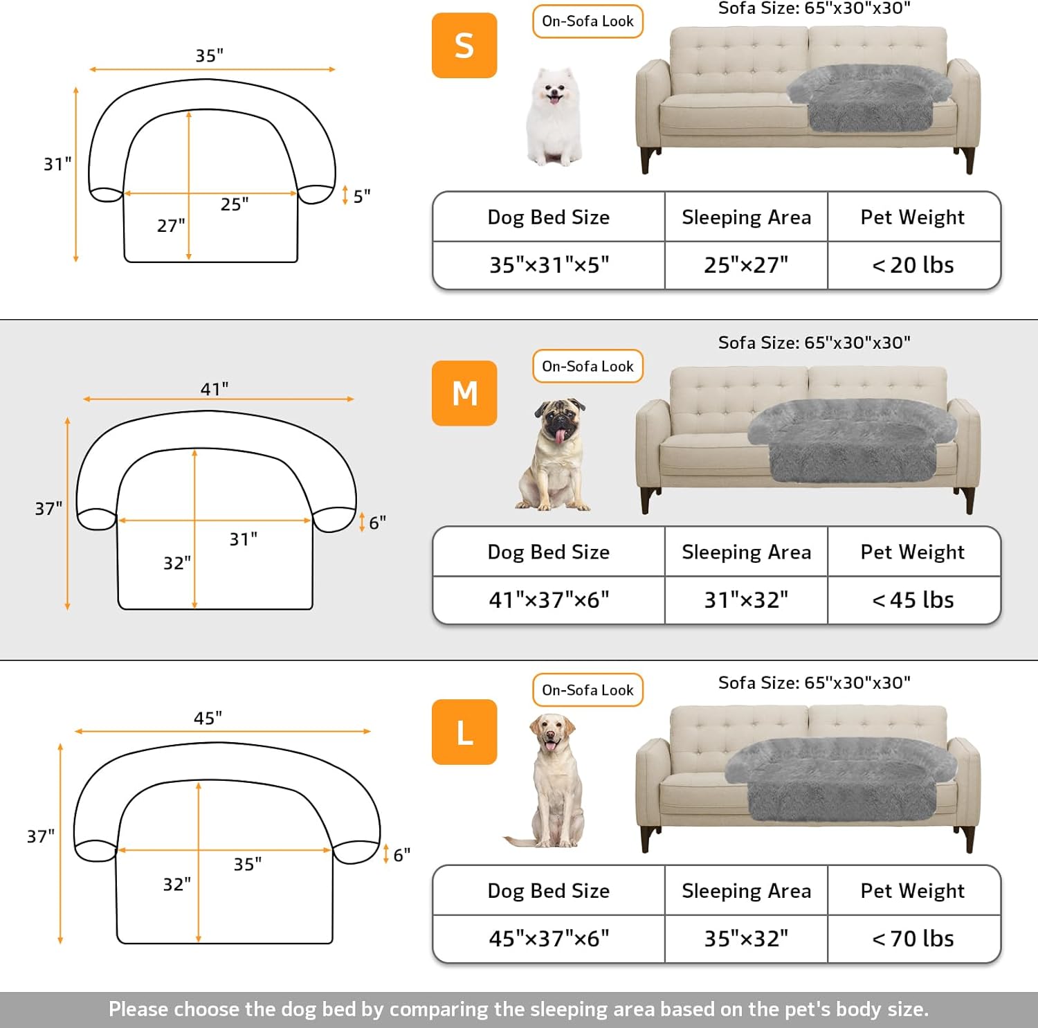 - 【Multiple Size Selection】The couch pet bed has 5 sizes for you to choose from. XS: 31"x23.5" dog bed for small pets. S: 35“x31" dog bed for cats and small dogs. M: 41”x37" dog bed for medium dogs. L: 45“x37" dog bed for large dogs. XL:53"x39" dog bed for large dogs. We have enlarged the sleeping area for pets to give dogs more space.