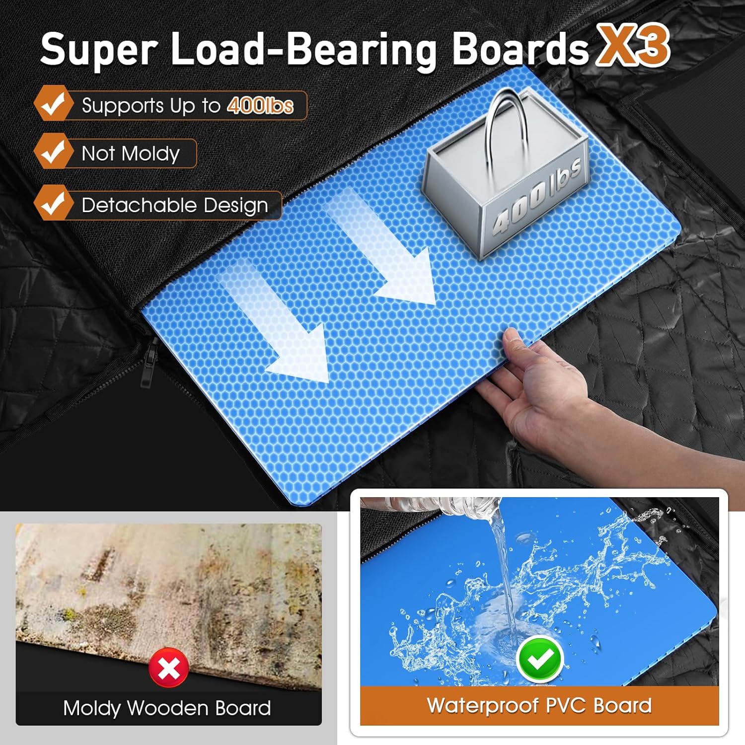- [Larger Space Backseat Extender for Dogs]: Hard bottom car seat cover for dogs has 3 pieces built-in thick honeycomb load bearing panel with support up to 400 lbs, featuring waterproof, rust and compression resistant, which extend large activity space for dogs. On the other hand, the detachable design makes it easy to remove.