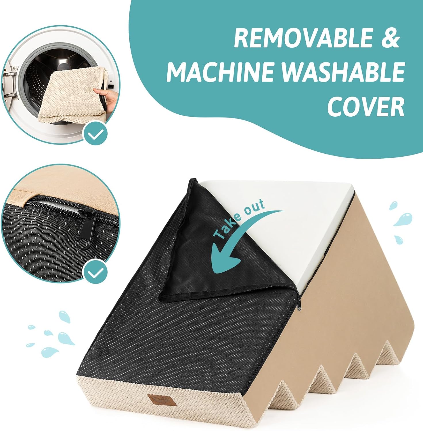 - Non-Slip Base and Removable Cover: Our dog steps for beds are equipped with a non-slip base featuring rubber dots for additional grip, minimizing movement during use. The pet steps cover is waterproof on the inner side, so you don’t have to worry about stains seeping into the foam. The outer cover is removable and machine washable for easy cleaning