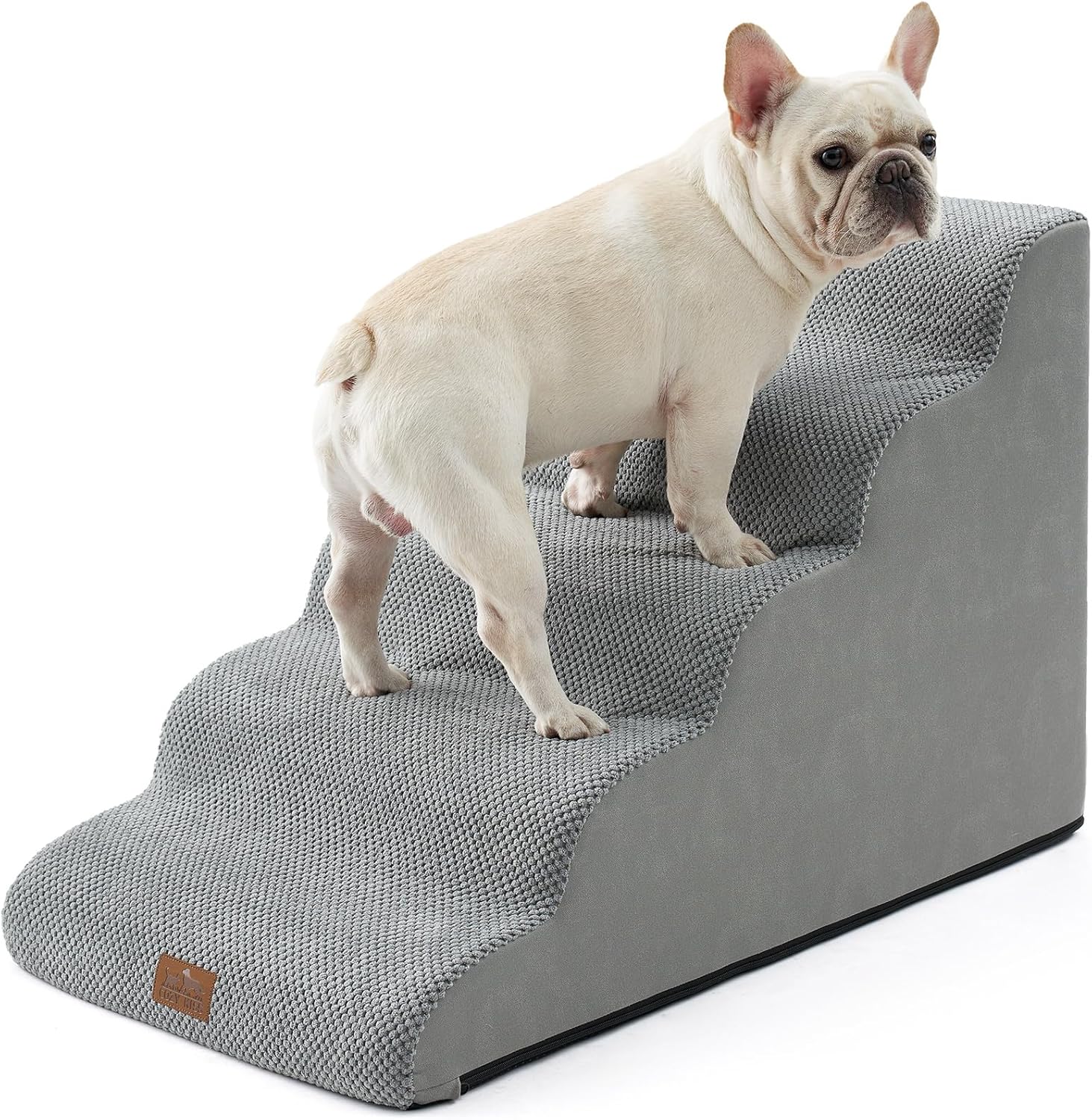 - WIDER DOG STAIRS: With a width greater than the standard 15.7 inches, it is suitable for small, medium, and large dogs. The soft and comfortable curved ramp design is more suitable for puppies and pets with knee injuries. Dog stairs are designed to lean against the edge of a bed, sofa or other furniture. Due to vacuum compression, it takes 24-48 hours to return to its original shape. There are wrinkles when opening the packaging, you can iron it to keep it flat