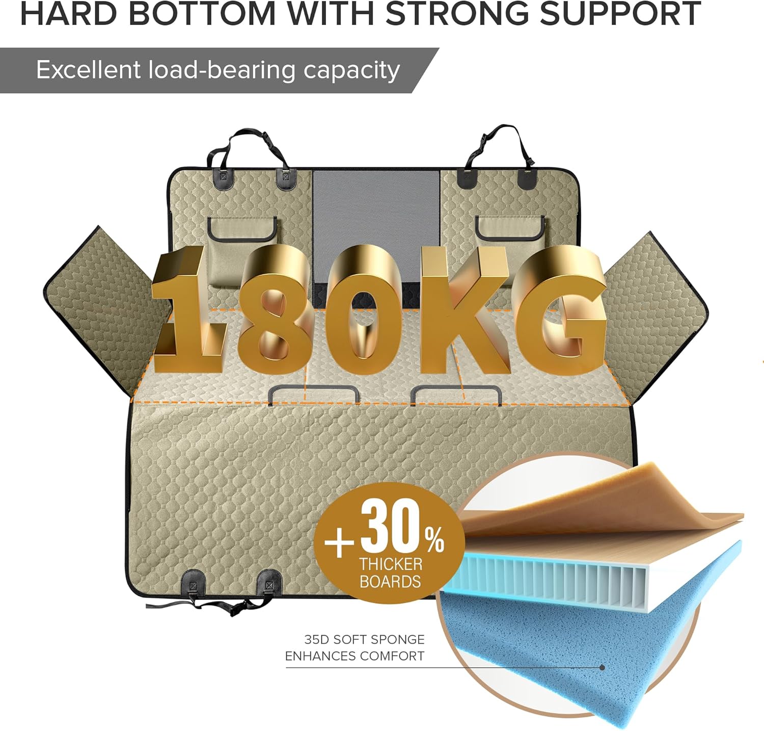 - MAXIMIZED 99.9% SPACE WITH BACK SEAT EXTENDER FOR DOGS - The hard-bottomed design adds nearly 40% of extra flat space, optimizing your pickup's rear seat area. This dog hammock for truck comes with three robust boards for ample movement and comfort. Four side flaps serve as buffers, keeping your pet secure during sudden stops for a untroubled travel experience