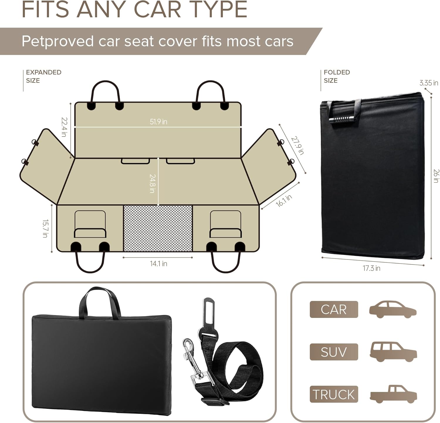 - FIT FOR ALL VEHICLE TYPES - Back seat protector for dog sized 63x52 inches that designed to effortlessly accommodate a wide range of vehicles. Whether family car, SUV, or pickup truck, this large dog car seat will fit well and provide the protection your vehicle needs. Universal rear seat cover is foldable, ensures quality and convenience, back seat extender for dogs keep car clean and secure. This pet car seat cover is perfect dog accessories and dog car seat for large dogs for all your journey