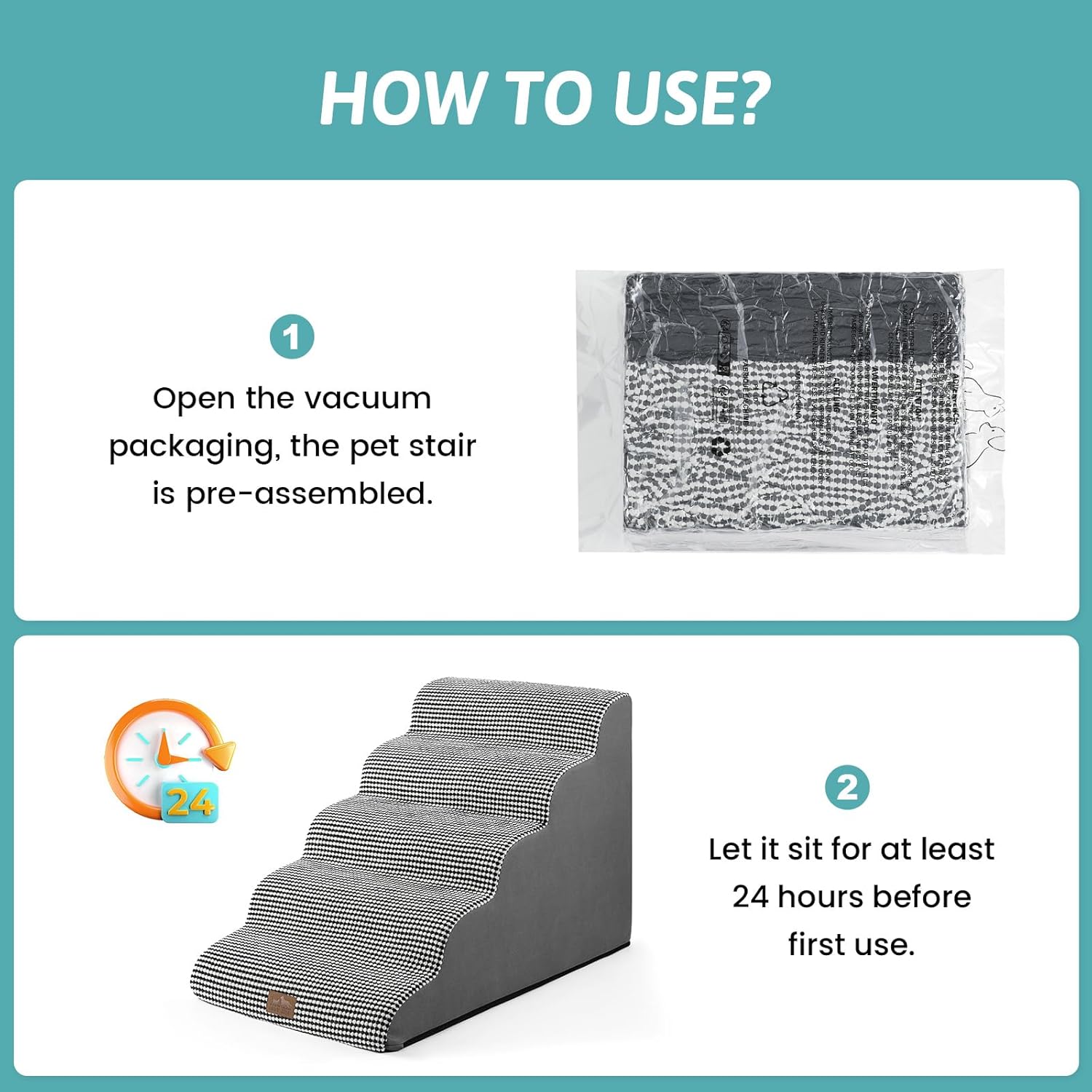 - EXTRA WIDE PET STAIRS: This wide dog ladder is designed to lean against the edge of a bed, car or other furniture. This is a portable dog ladder suitable for small, medium or large dogs. Please note that due to vacuum compression, it takes 24-48 hours for the sponge to rebound. There are wrinkles when opening the packaging, which is the result of long-term compression. You can iron it to keep it flat