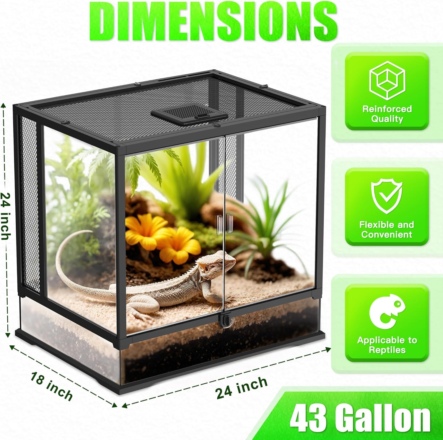 24’’18’’24’’ Reptile Terrarium with Full View Tempered Glass, 43 Gallon Reptile Habitat Comes with Feeding Port and Mesh Top Vent, Suitable for Most Reptiles Such as Chameleon, Lizard and Snake