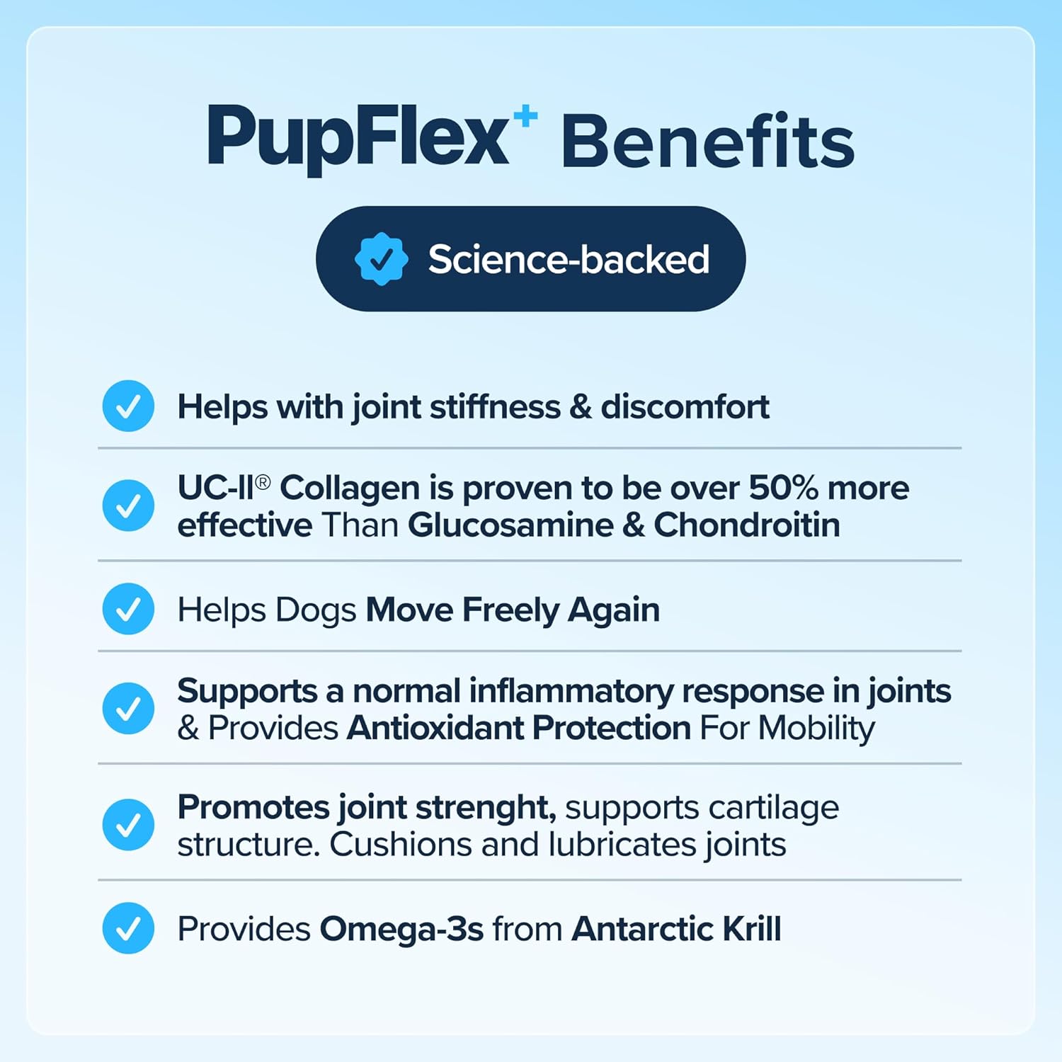 - TASTY, ALL-NATURAL SUPPORT DOGS LOVE – Made with Antarctic QRILL for Omega-3s and antioxidants, PupFlex+ promotes joint health and vitality. Non-GMO, veterinarian-formulated, certified by VetEvaluated, a premium choice in dog health supplements.