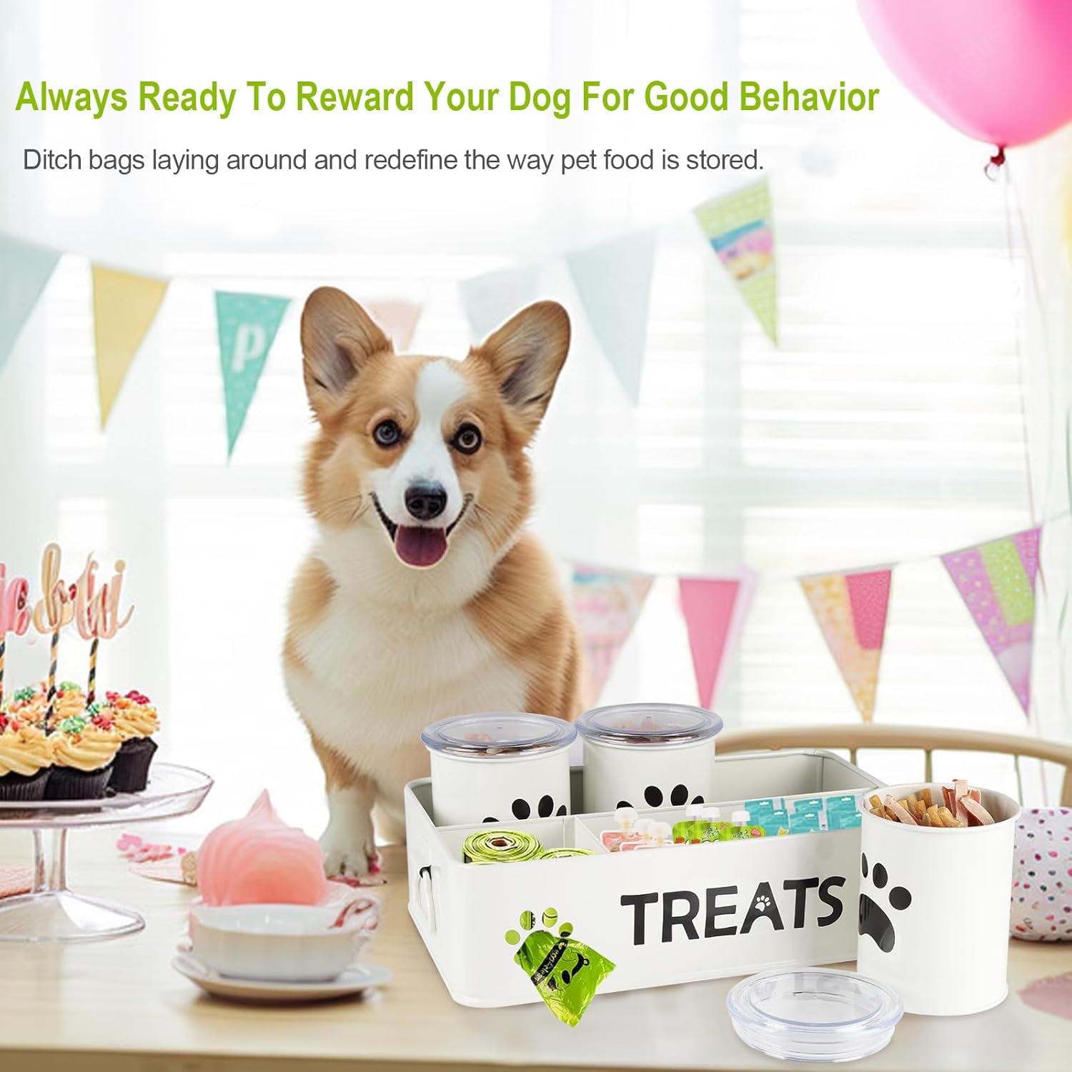 - 【Dog Stuff Organizer】-The dog treat station has 3 compartments, which not only can be used for dog cat kibble,also can be to sort and organize various dog stuff such as Dog canned treats,Dental Sticks, Dental Chews,Bagged snack,Bagged Biscuit,Bottled nutritional supplements,Nursing supplies.Perfect for Countertops.