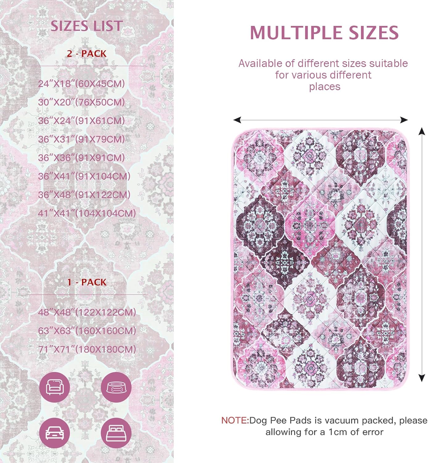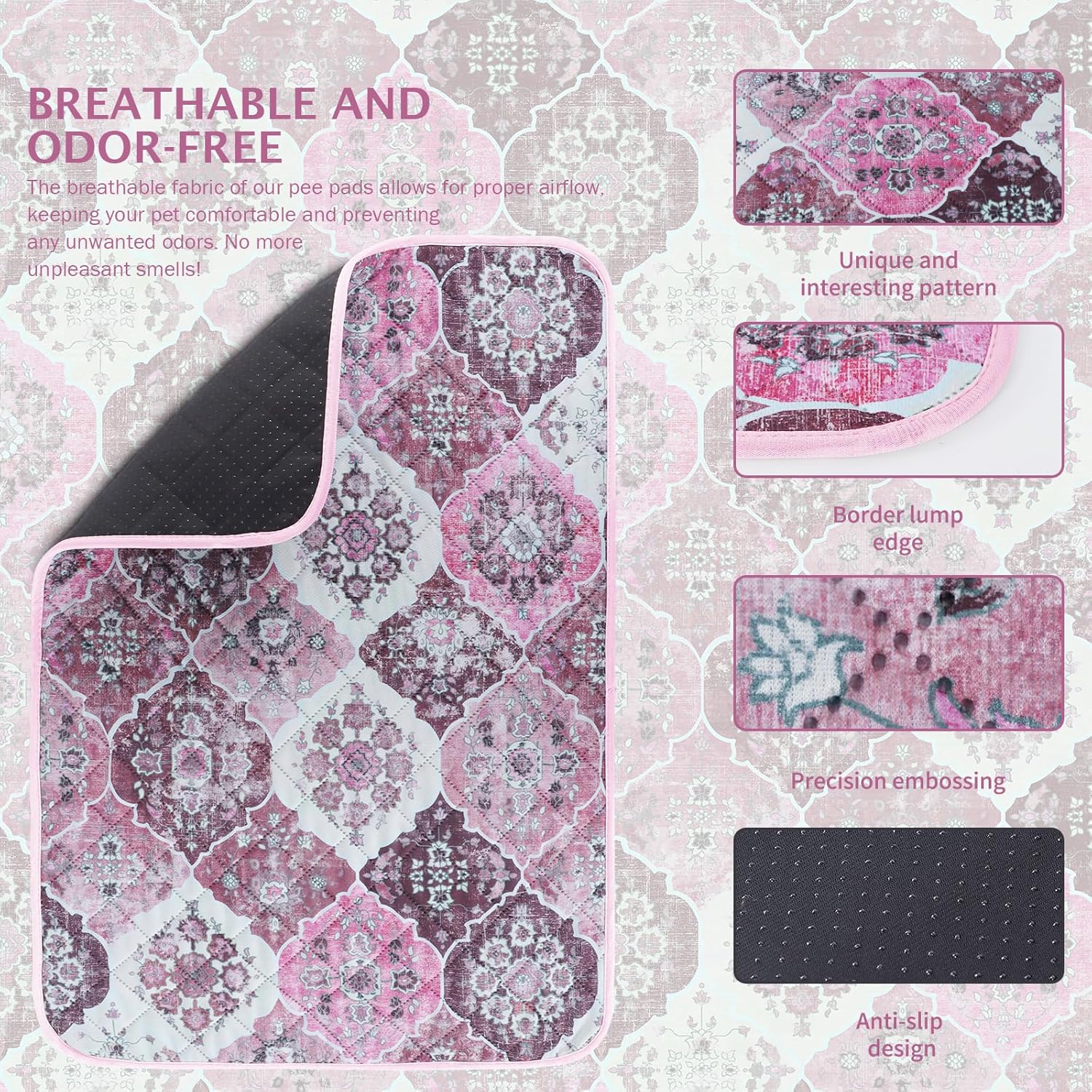 - 【Fashionable and Non-Slip】Our bohemian-print design adds a natural touch to the potty pads for dogs, giving your room a warm, casual vibe. And the non-slip bottom design makes the pet pee pads can achieve a certain fixed effect, you can put it anywhere you want. Soft and non-slip material makes it safer for dogs to use the pads.