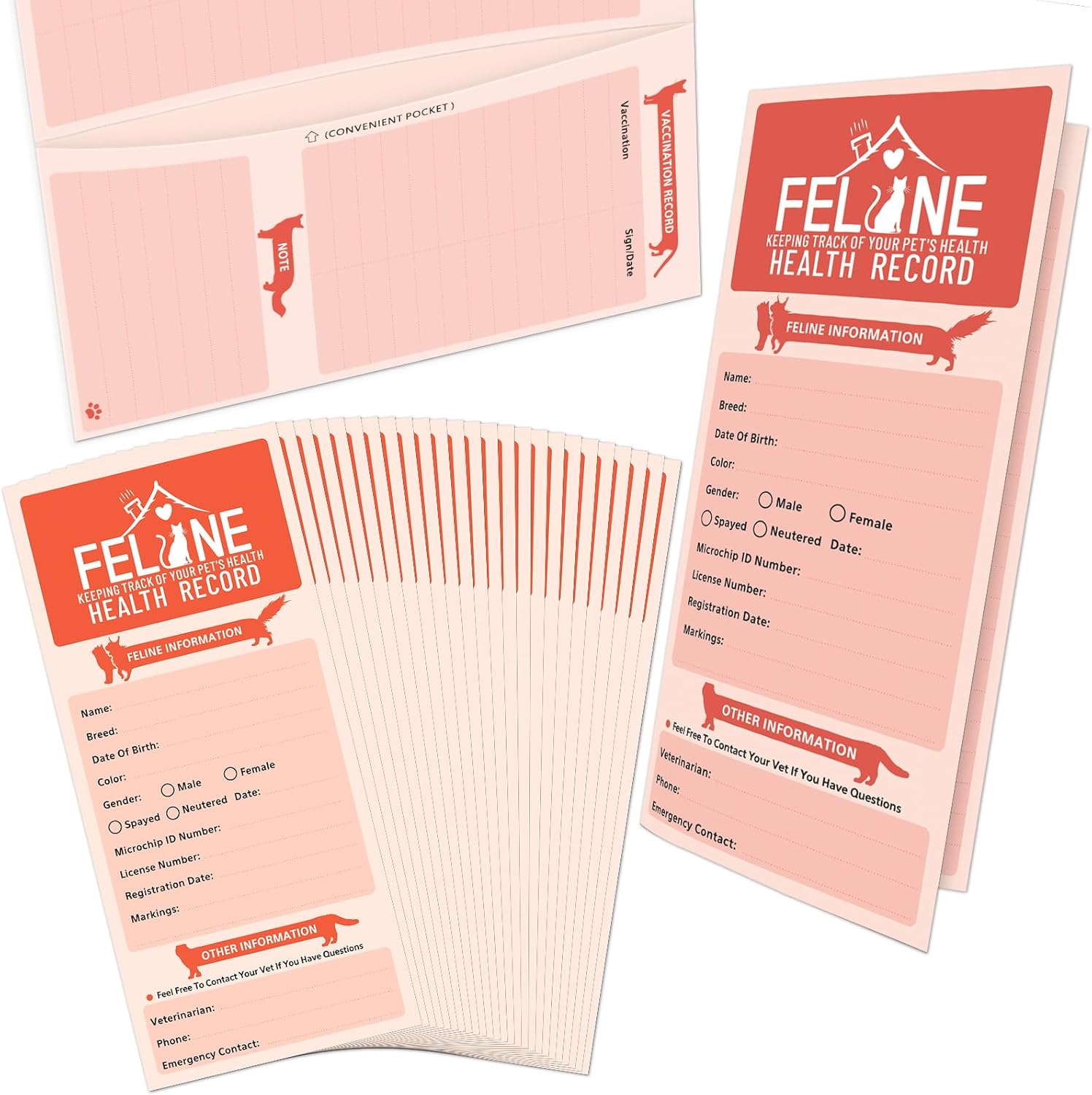 - [Function] The 24 Bulk Pack Kitten record is suitable for vet offices, breeders, and pet owners to track feline immunization records, deworming schedules, weight logs, vet appointments, medical history, and pet information (breed, age, gender, owner contact).