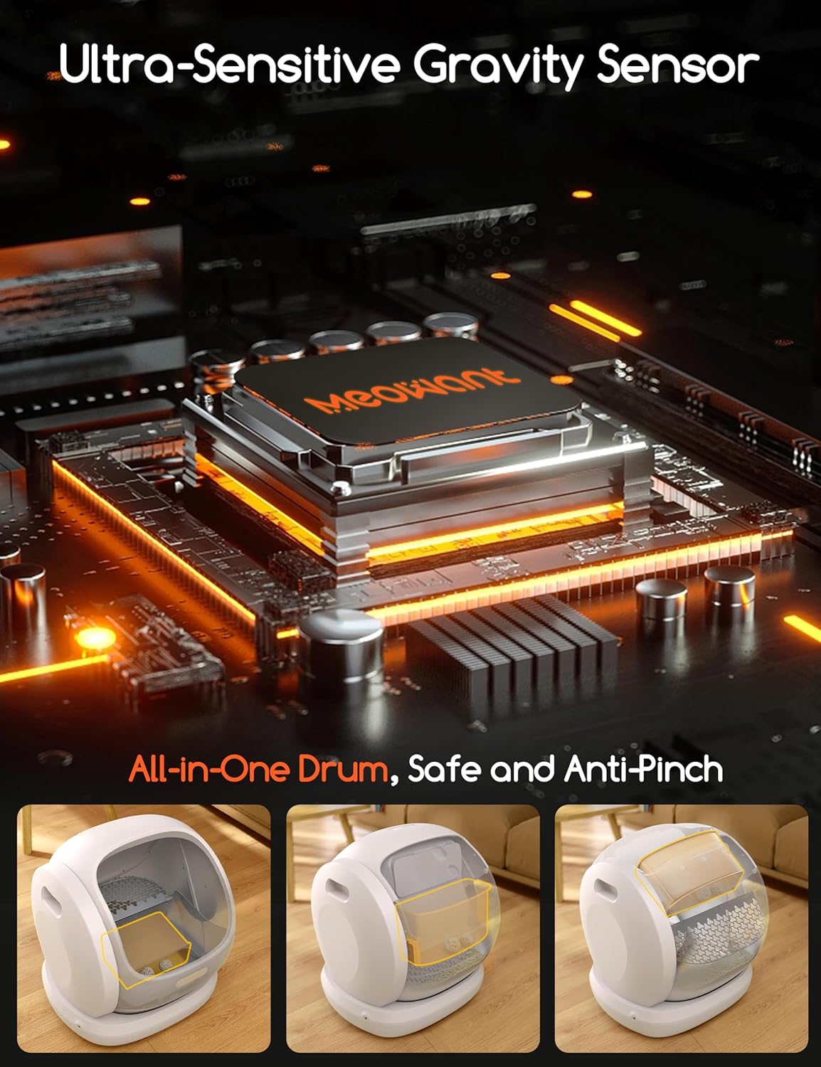 - Odor Control & Whisper-Quiet: The Meowant automatic litter box features an odor-proof cover that effectively contains smells, while a scented gel keeps the litter box fresh. The ultra-quiet motor operates at just 38dB, ensuring a peaceful environment for you and your family.