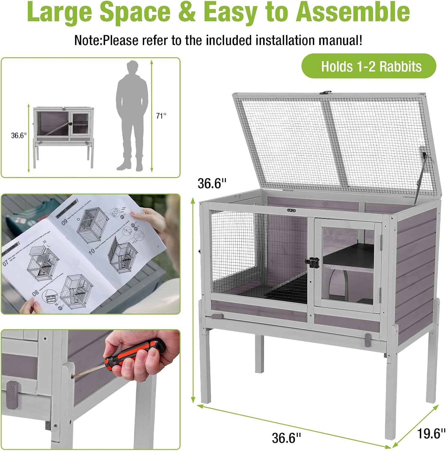 - Spacious Activity Space: Measures 36.6''L x 19.6''W x 36.6''H, providing ample space for 1 rabbit and 1-2 hamsters, guinea pigs, or gerbil.