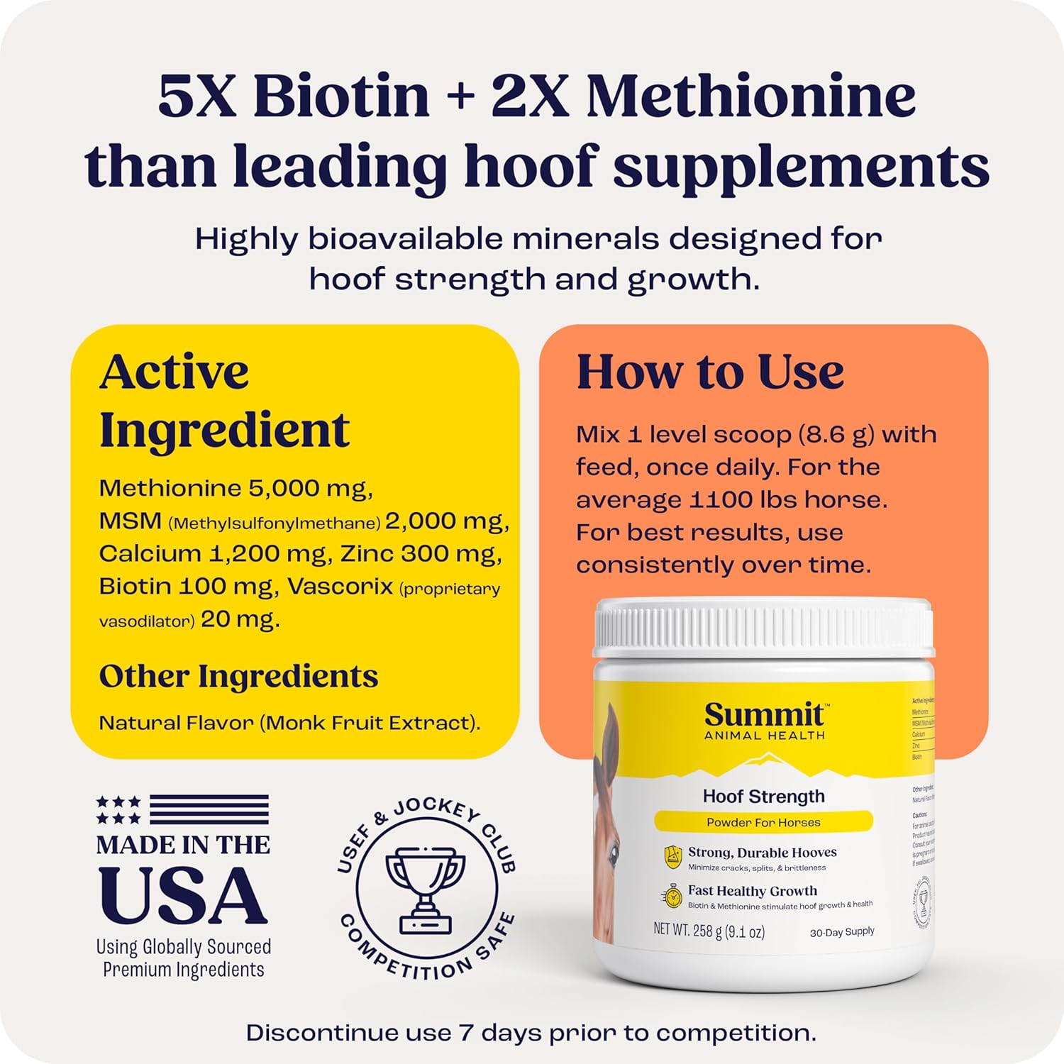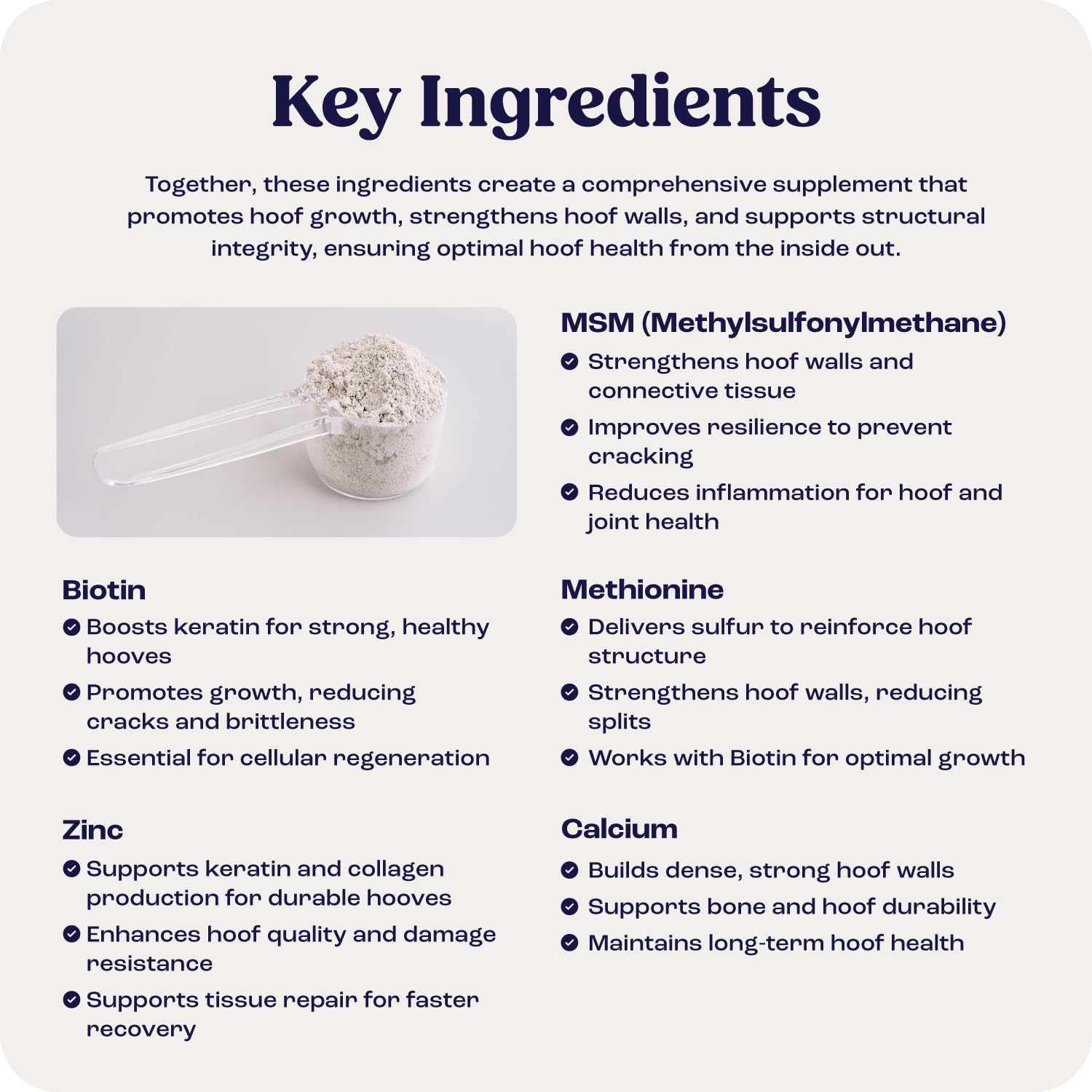 - 5X Biotin & 2X Methionine for Superior Hoof Health – Outperform leading hoof supplements with 5X more Biotin and 2X more Methionine per scoop, promoting consistent hoof growth and fortifying hoof walls to prevent cracks and brittleness.