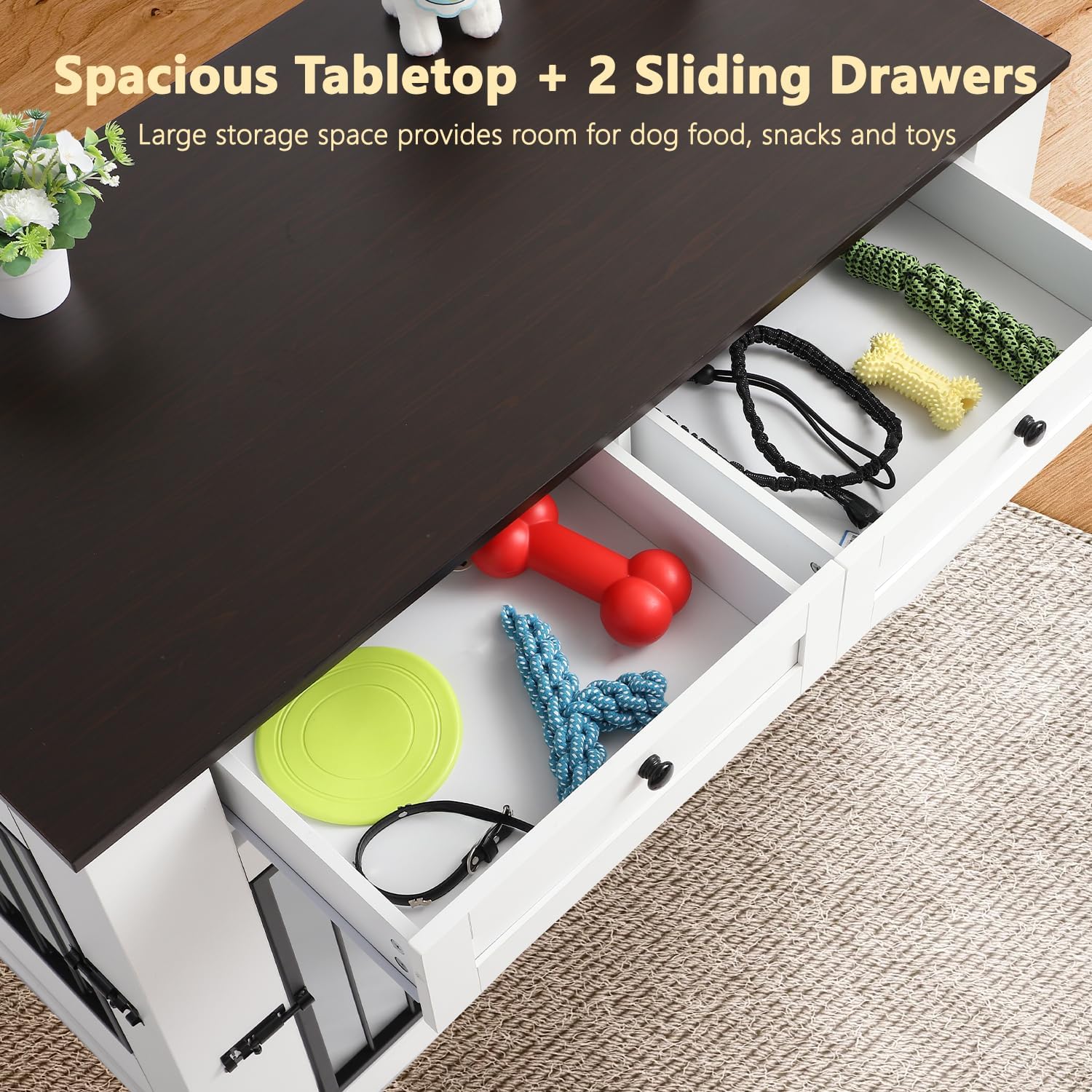 - Storage: Our dog kennel furniture features a spacious 47.2 "L x 23.8"W table top that can be used to display photo albums, potted plants or decorations. Load capacity up to 180 pounds. Two equal sized drawers for your dog's toys, clothes, etc. These Spaces are enough to keep your dog's toys, bowls, food, etc. tidy and organized