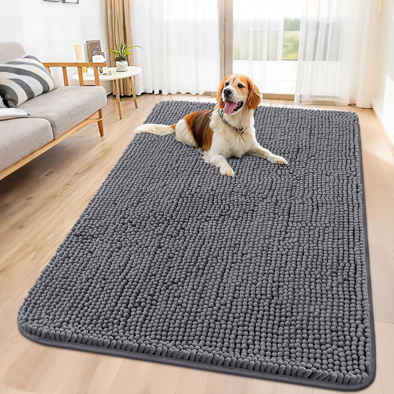 - [Absorbent and Dirt Trapper] High-density chenille dog mat, super absorbent and dirt-catching, whether wet after shower, muddy or moisture bring back by dogs, it can absorb well, so that you and your favorite pet can say goodbye to the wet and mud. It's an excellent choice for use as an entryway door mat, a welcome door mat or a dirt-trapping door mat.
