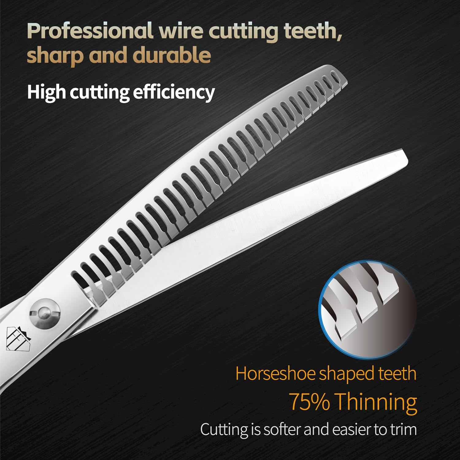 - Features: This pet curved thinning scissors are available in 6.5 inches with ergonomic handles, suitable for most people. Finely polished, frosted surface, fine metal texture. precise adjustable screws effectively prevents screws from loosening due to prolonged use