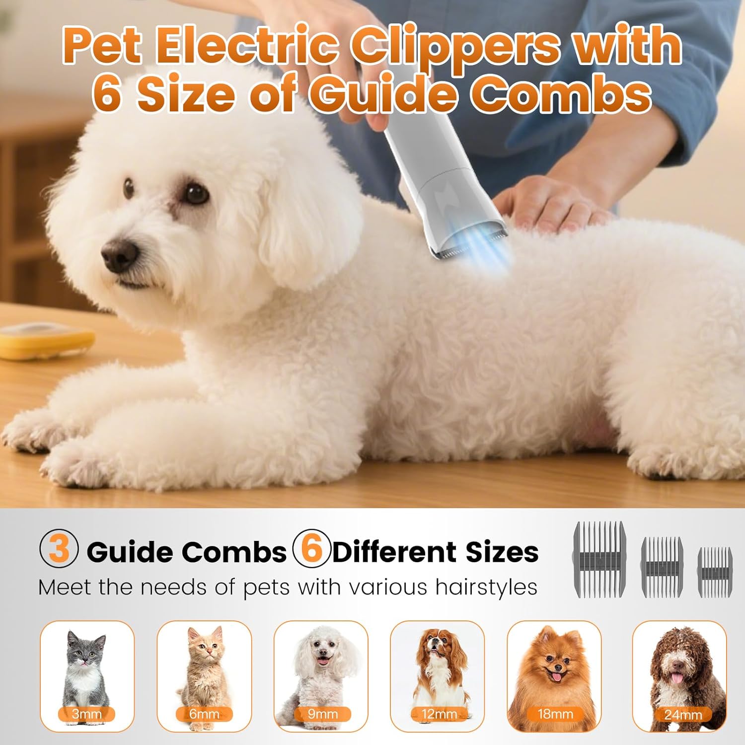 - MULTIPLE GUIDIE COMES - 6 different-sized guide combs(3mm & 6mm & 9mm & 12mm &18mm & 24mm) can be used to trim pet hair of different lengths. This allows you to achieve the perfect look for your pet, regardless of their hair length.