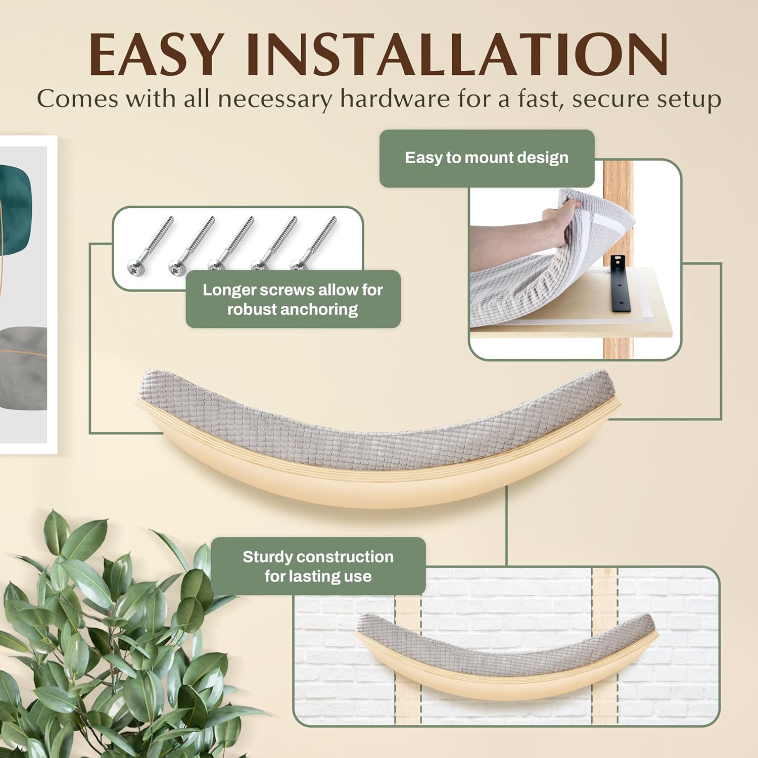 - SECURE & EASY INSTALLATION – Includes all necessary hardware for mounting into wall studs, ensuring stability and safety for your cat. This wall-mounted cat bed is easy to install and can be combined with other cat shelves and perches for wall to create a custom cat wall climbing system.Unlike other shelves that rely on weak drywall anchors, our extra-large cat perch wall mounts securely into wall studs for superior durability to ensure a sturdy and safe cat climbing setup on drywall, brick, or concrete walls.