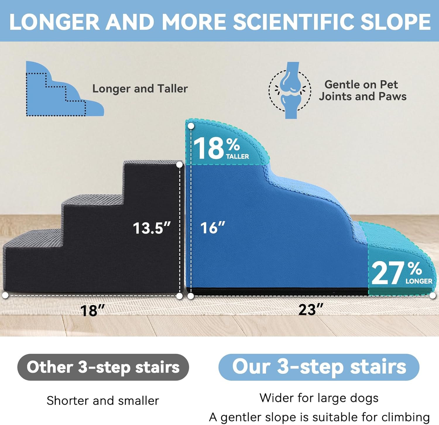 - Multi Sizes Fit Every Need: Zerbuger foam dog stair is not suitable for large dogs, please use it for pets under 50lbs! 3-steps are suitable for chairs and couches up to 20inch, 4-steps are suitable for high sofas, beds and window up to 25inch. Please confirm whether the size is suitable for your love pet first.
