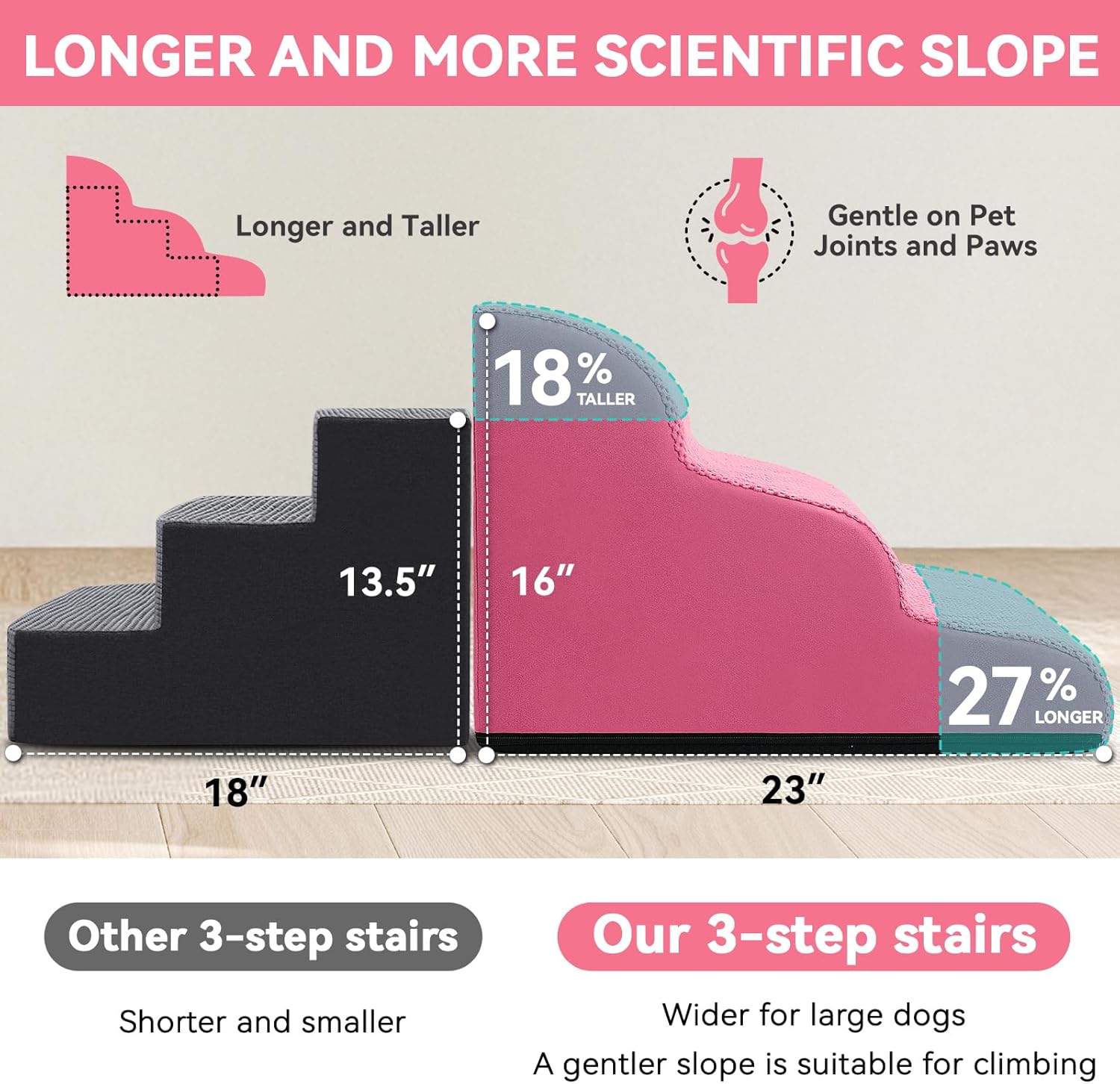 Dog Ramp and Stair for Bed 16" H-20 H,3-Step Cat Stair for Sofa and Chair,4-Step Dog Ramp for High Bed and Window,Durable Nonslip Fabric Cover for Indoor (Pink-16 H, Pet Friendly, 3)