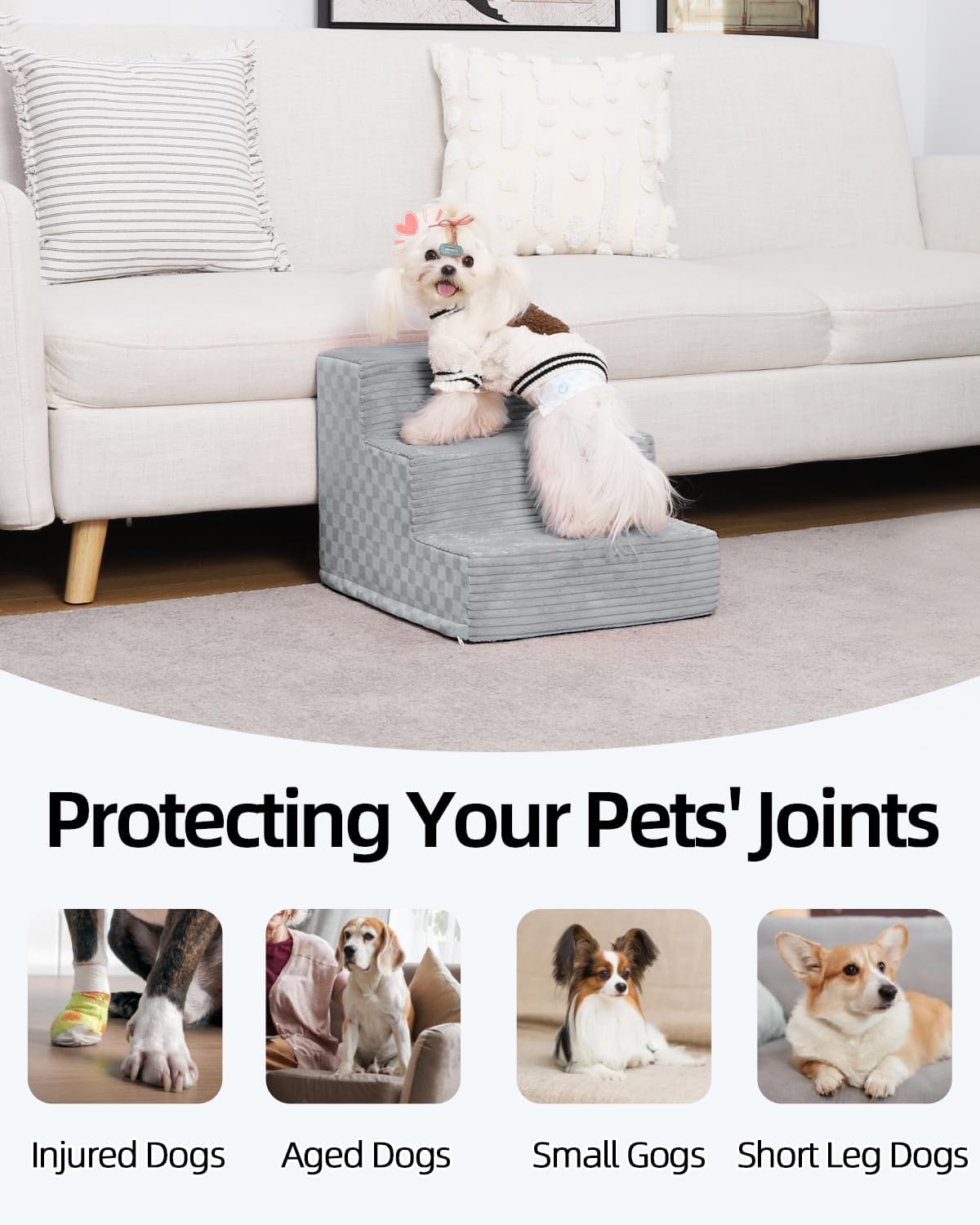 - 【3 Sizes&3 Colours】: The steps for dogs comes in 3 sizes: 3-step (up to 15" for chair and couch), 4-step (up to 21" for couch and bed), and 5-step (up to 24" for high bed and car),and is available in grey, pink, and khaki.