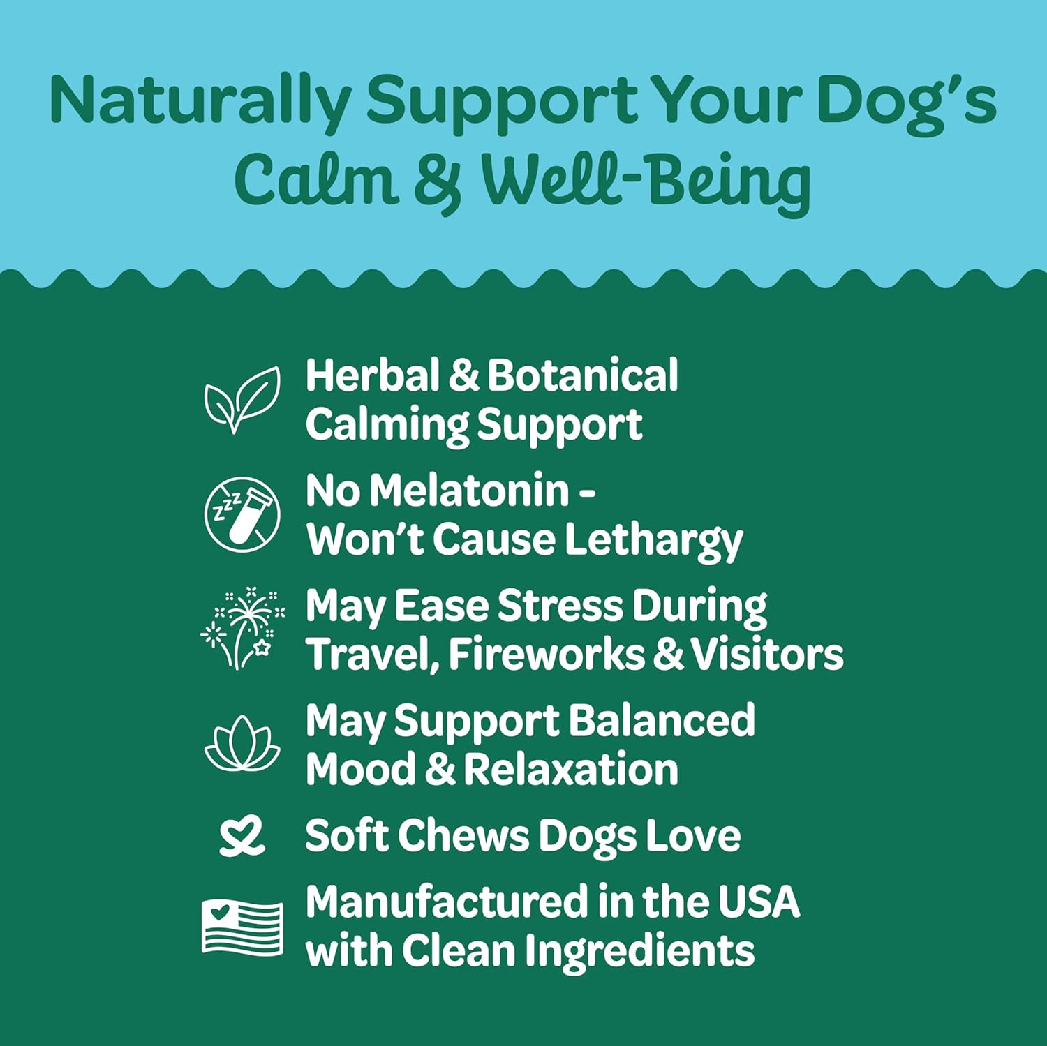 - CALMING SUPPORT FOR DOGS – Soft chews help ease anxiety from separation, thunderstorms, car rides, or crate training — all without drowsiness or sedation.