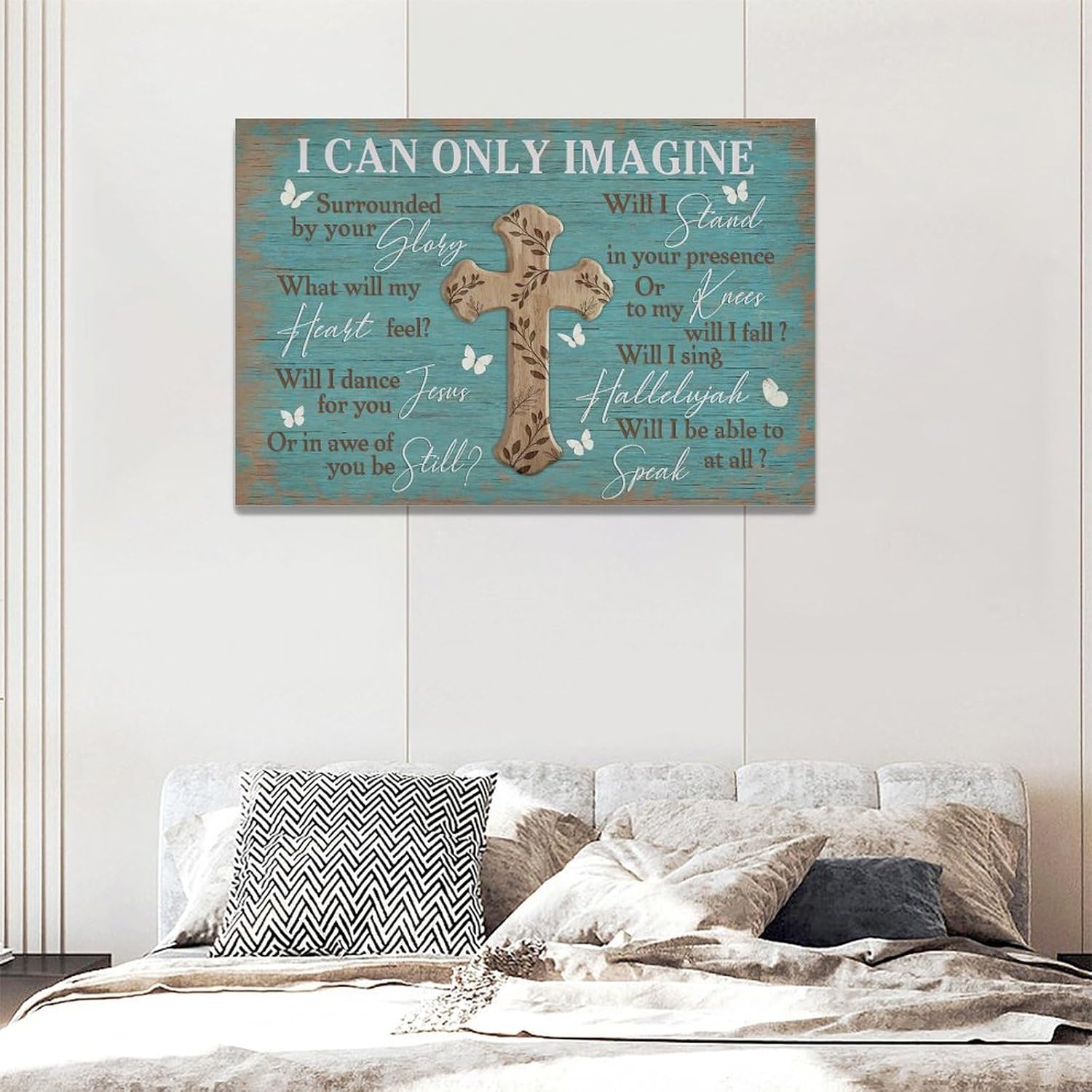 Rustic Christian Cross Wall Art I Can Only Imagine Pictures Farmhouse Butterfly Wall Decor Teal Motivational Canvas Print Painting Artwork for Bathroom Living Room Bedroom 16"x24"