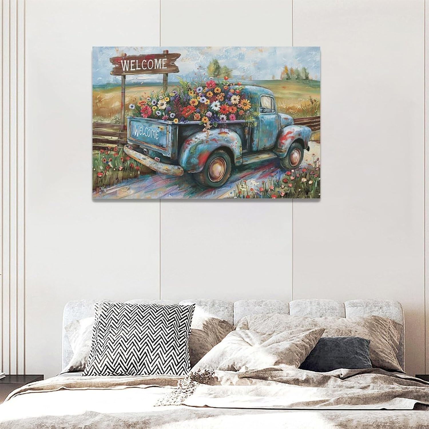 Farmhouse Truck Wall Art Rustic Country Wildflowers Wall Decor Road Flowers Landscape Pictures Canvas Print Painting Artwork for Bathroom Living Room Bedroom 16"x24"