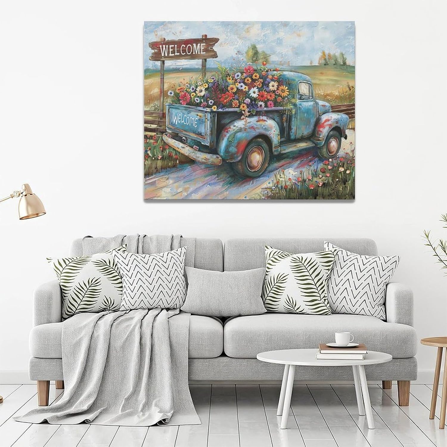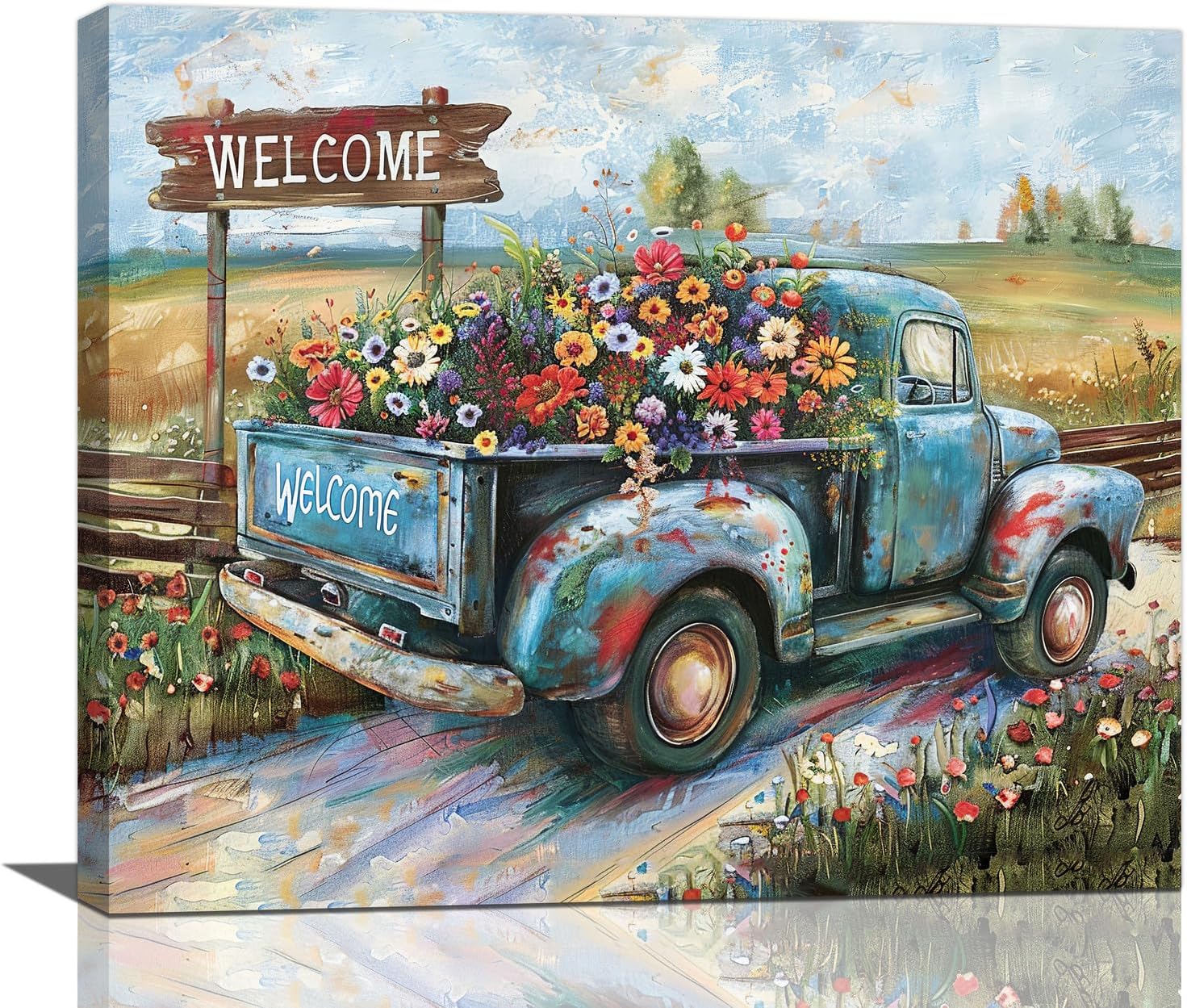 Farmhouse Truck Wall Art Rustic Country Wildflowers Wall Decor Road Flowers Landscape Pictures Canvas Print Painting Artwork for Bathroom Living Room Bedroom 20"x24"