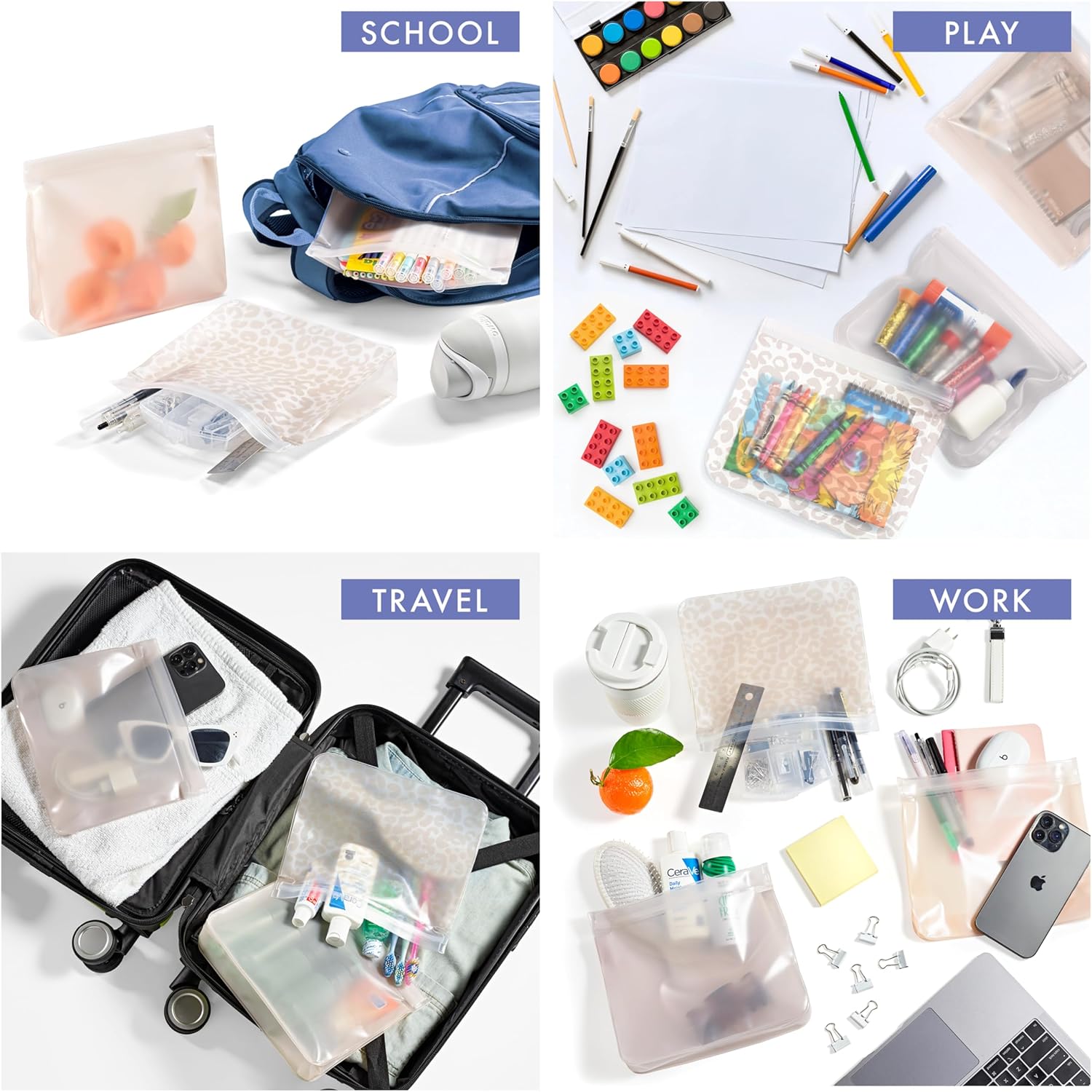 - MULTI PURPOSE - Ideal for any occasion, these reusable snack bags can hold food, toys, office supplies, travel essentials, and more! Conveniently compact and versatile, our silicone pouches easily fit in drawers, lunch bags, purses, and travel kits.