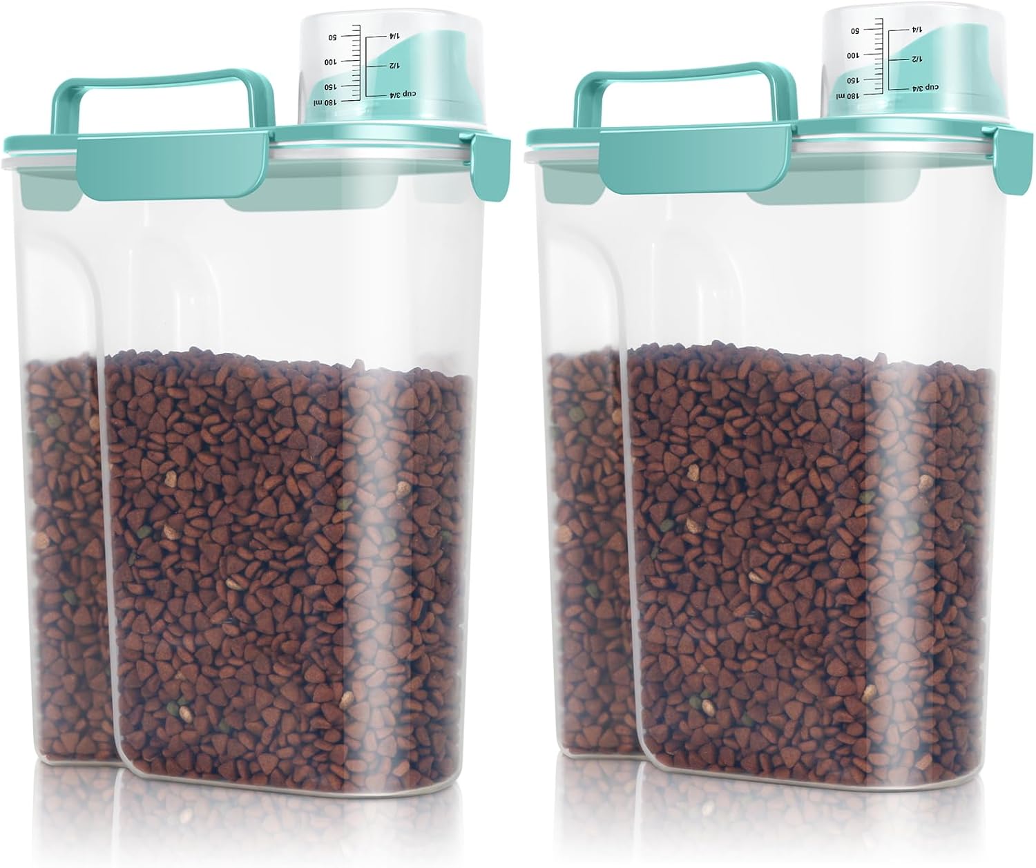 - Large Pet Food Container Set: TBMax dog food storage containers come with two 6-qt bins that each one can hold about a 5 to 7 lbs bag of dry dog food or cat food, which depending on the particles of the pet food. Ideal for storing small pet food like kitten puppy kibble, bird seeds, fish food and more