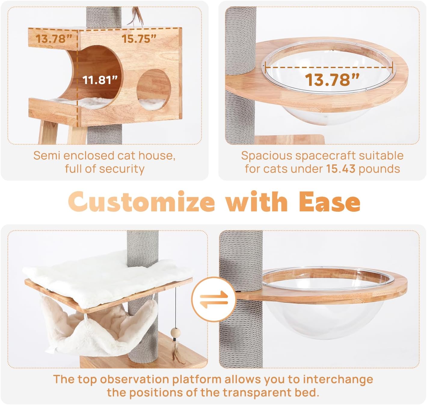 - 【Enjoy Diy Fun】The cat house comes with instructions and installation tools, and you can get a decorative cat furniture in just ten minutes. You can also interchange the positions of the top lookout and the capsule according to your cat's preferences, enabling DIY adjustments.