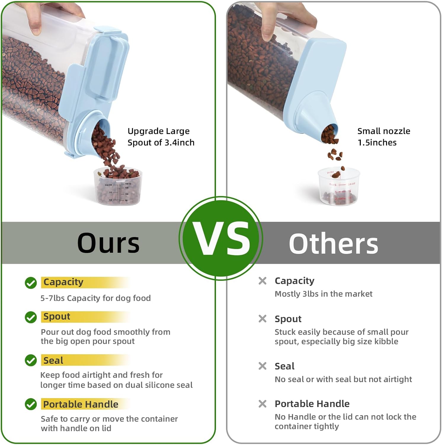 - FUNCTION : This airtight dog food container with portable handle has an airtight design,-has 2 silicone seals and 4 sealing buckles,which can keep your food dry and fresh, the portable handle and large spout design can easily Easily pours food out,also perfect for traveling, hiking, camping or picnicking with your dog
