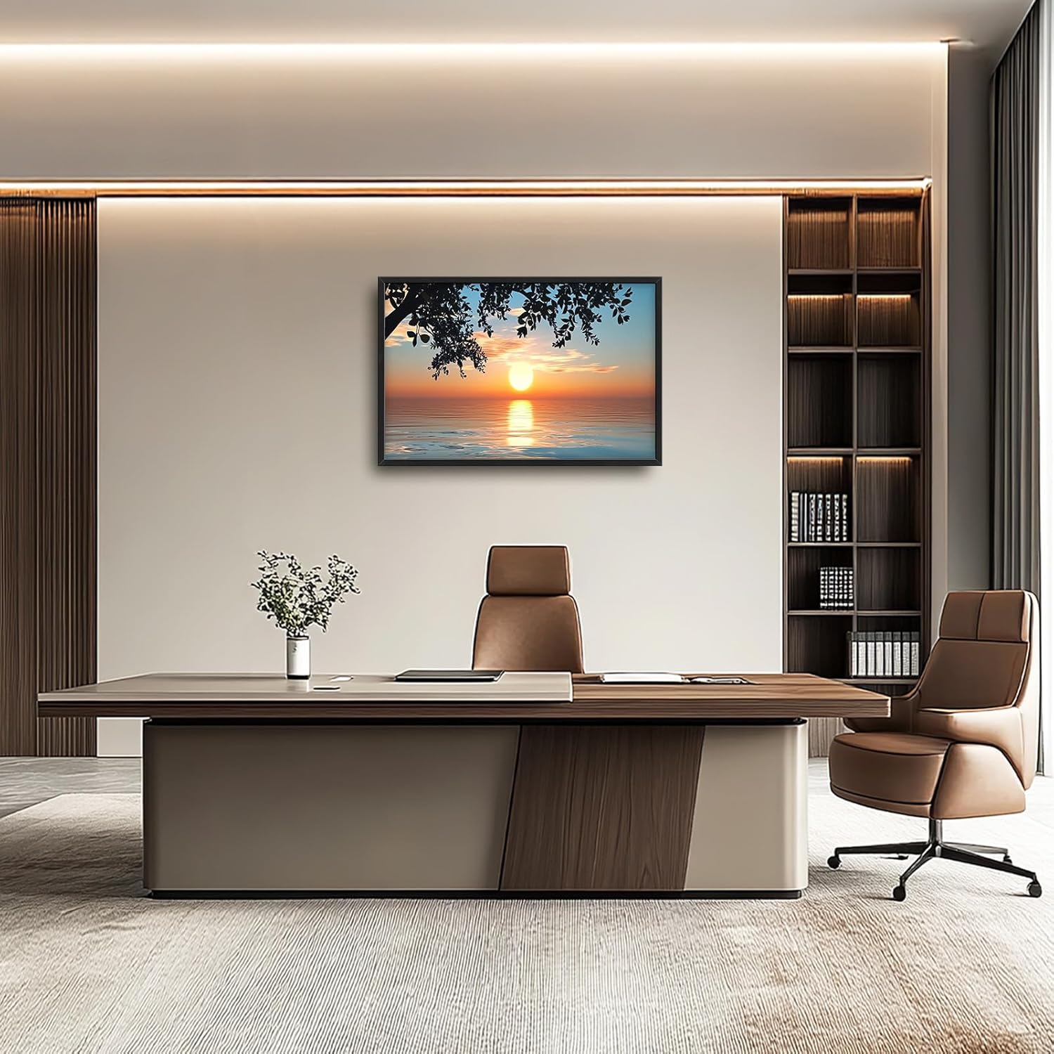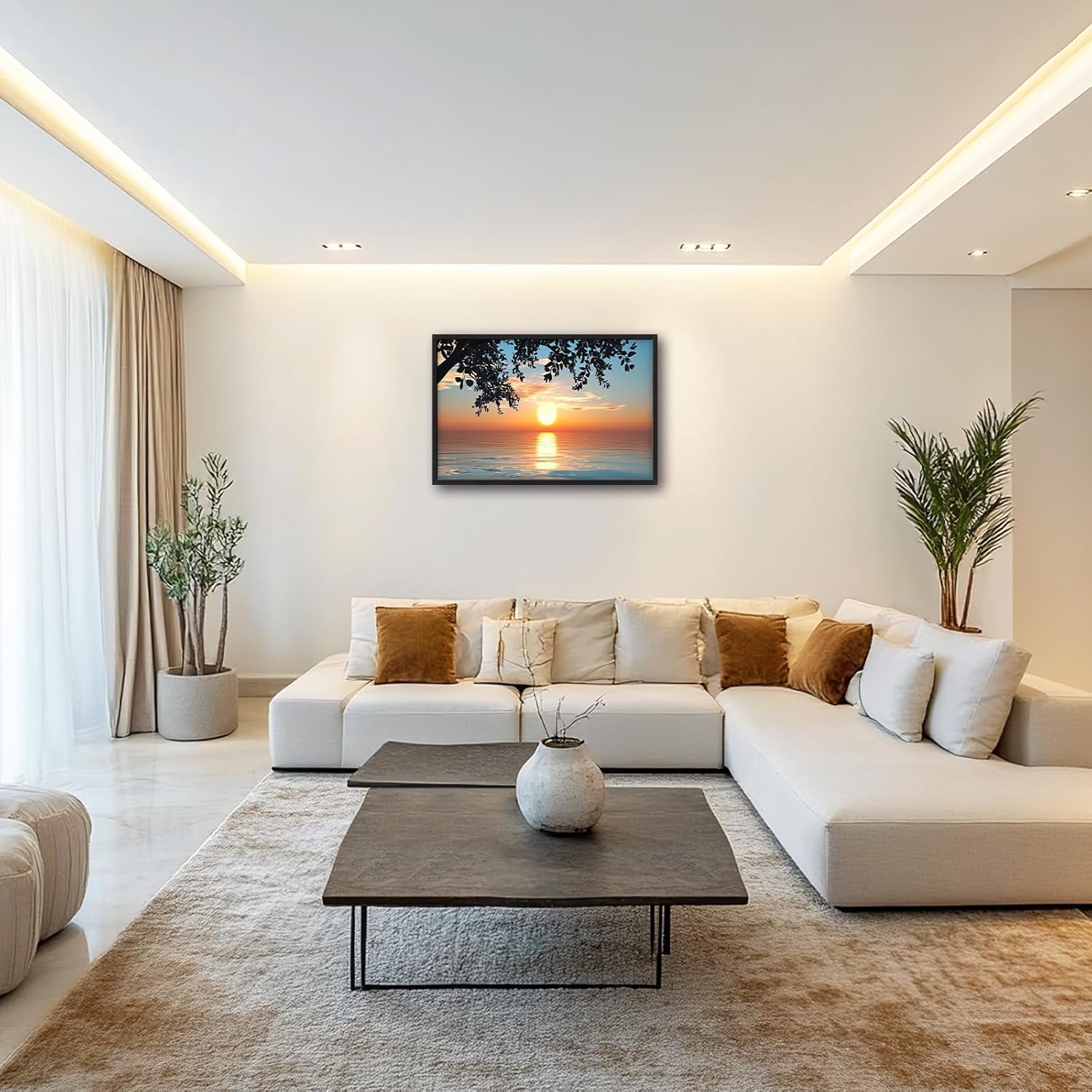 Framed Large Lake Sunset Wall Art, Oversized Natural Landscape Wall Decor for Living Room, Tree Leaves Canvas Painting Pictures Home Decoration for Living Room Bedroom Office 36"x24"
