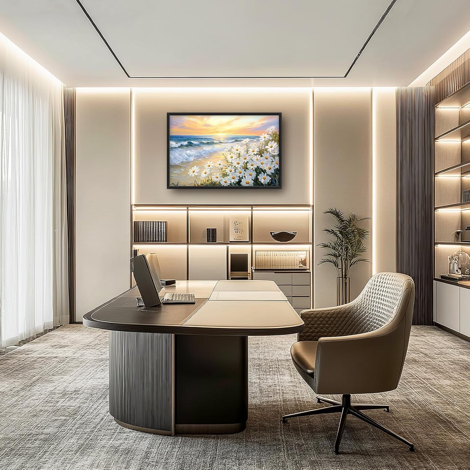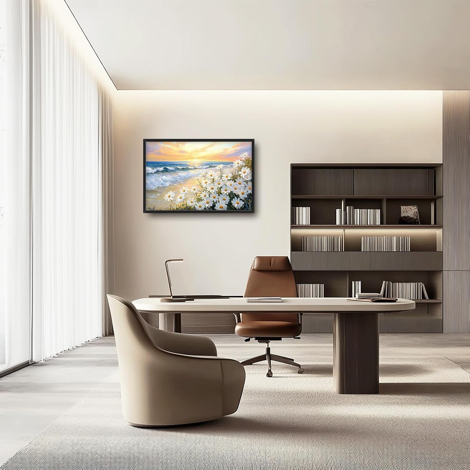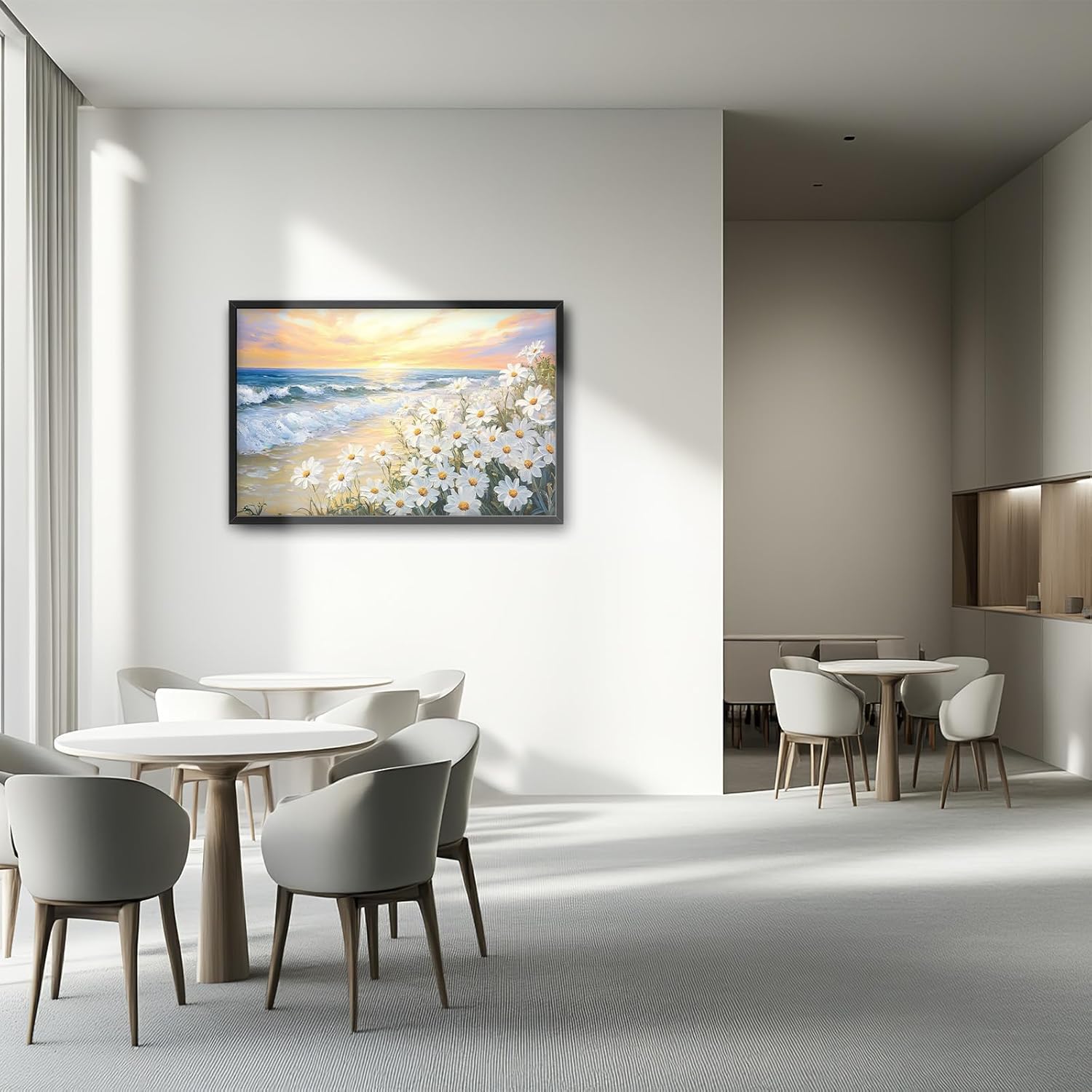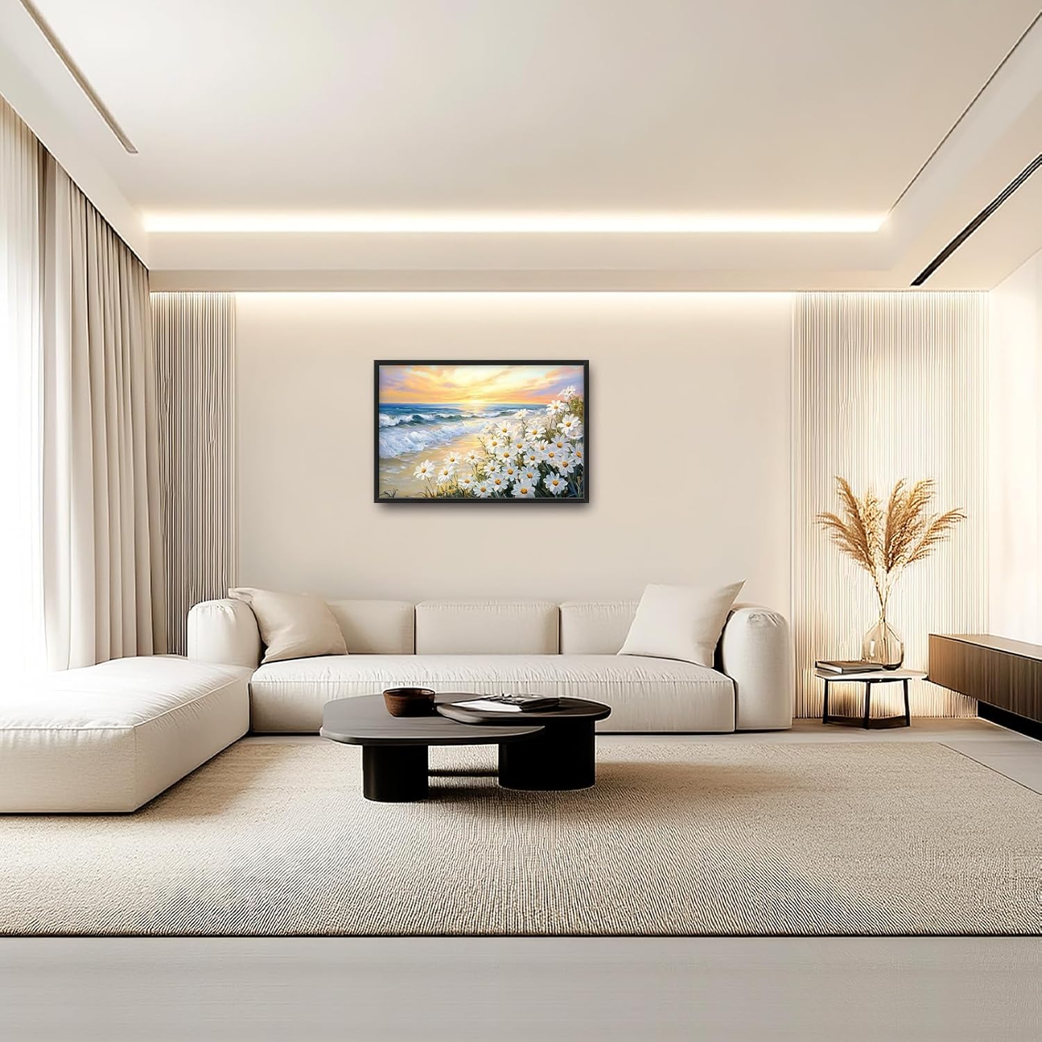 Large Beach Daisy Wall Art, Framed Coastal Beach Wall Decor for Living Room, Oversized Sunrise Canvas Painting Seascape Pictures Home Decoration for Living Room Bedroom Office 36"x24"