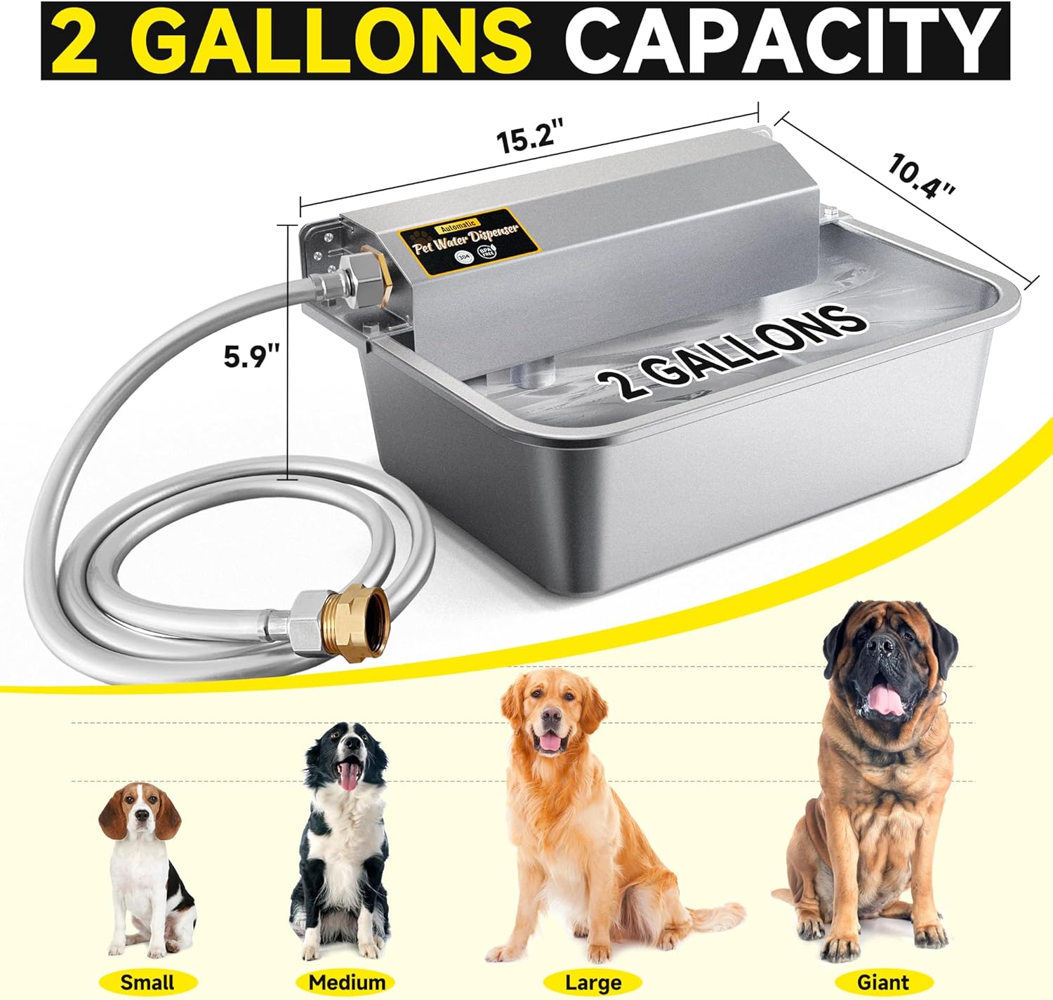 Automatic Dog Water Dispenser, 2 Gallons 304 Stainless Steel Large Dog Water Bowl Dispenser for Indoor/Outdoor, Pet & Livestock Water Feeder, Auto Fill, Fits GHT 3/4" Faucet, Easy to Clean